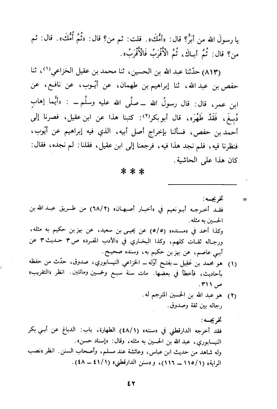 حَدَّثَنَا عَبْدُ اللَّهِ بْنُ الْحُسَيْنِ , ثنا مُحَمَّدُ بْنُ عَقِيلٍ الْخُزَاعِيُّ , ثنا حَفْصُ بْنُ عَبْدِ اللَّهِ , ثنا إِبْرَاهِيمُ بْنُ طَهْمَانَ , عَنْ أَيُّوبَ , عَنْ نَافِعٍ , عَنِ ابْنِ عُمَرَ , قَالَ: قَالَ رَسُولُ اللَّهِ صَلَّى اللهُ عَلَيْهِ وَسَلَّمَ: «§أَيُّمَا إِهَابٍ دُبِغَ فَقَدْ طَهُرَ» ، قَالَ أَبُو بَكْرٍ: كَتَبْنَا هَذَا عَنِ ابْنِ عَقِيلٍ، فَصِرْنَا إِلَى أَحْمَدَ بْنِ حَفْصٍ فَسَأَلْنَا بِإِخْرَاجِ أَصْلِ أَبِيهِ الَّذِي فِيهِ إِبْرَاهِيمُ عَنْ أَيُّوبَ، فَنَظَرْنَا فِيهِ، فَلَمْ نَجِدْ هَذَا فِيهِ، فَرَجَعْنَا إِلَى ابْنِ عَقِيلٍ، فَقُلْنَا: لَمْ نَجِدْهُ، فَقَالَ: كَانَ هَذَا عَلَى الْحَاشِيَةِ