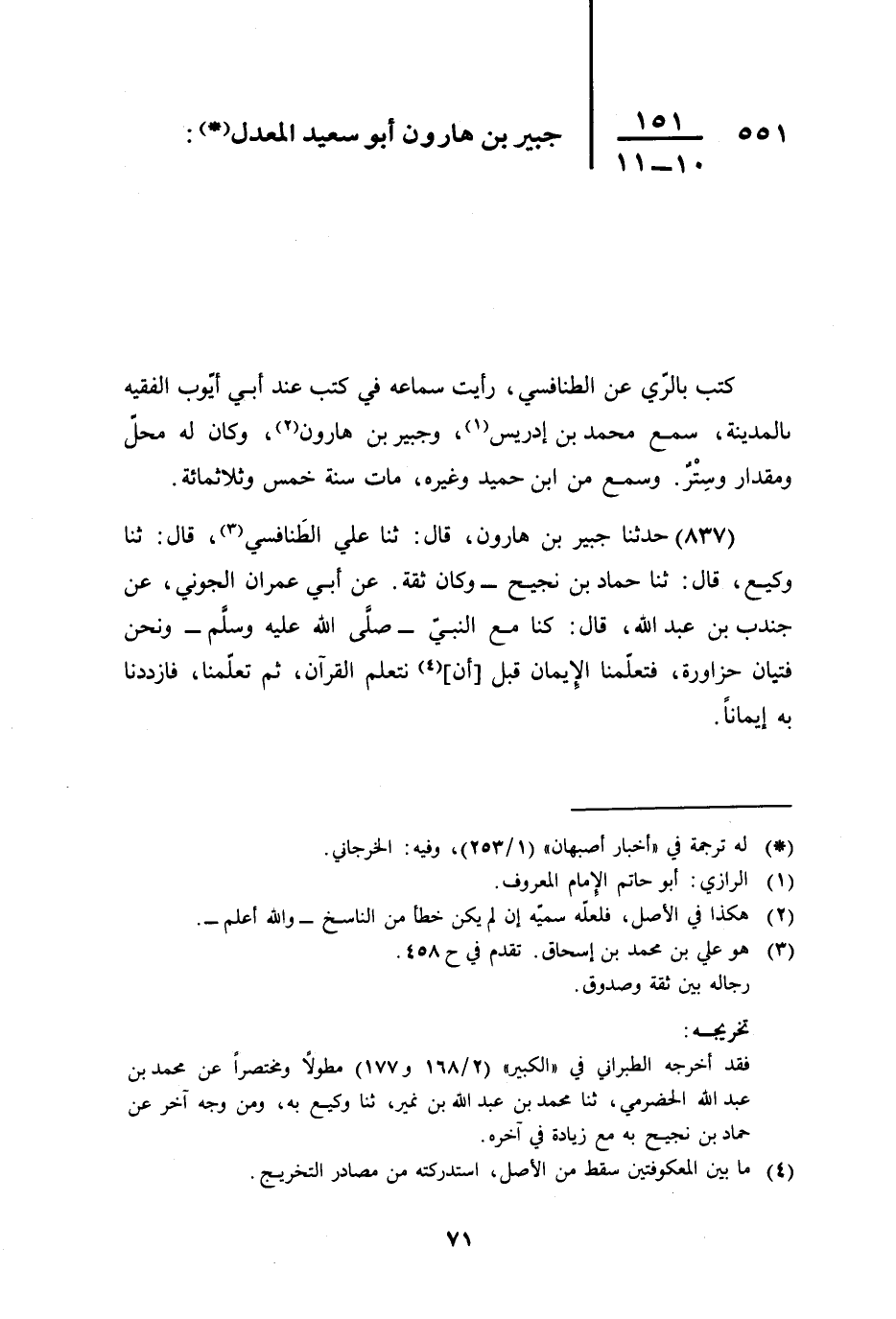 حَدَّثَنَا جُبَيْرُ بْنُ هَارُونَ , قال: ثنا عَلِيُّ الطَّنَافِسِيُّ , قال: ثنا وَكِيعٌ , قال: ثنا حَمَّادُ بْنُ نَجِيحٍ , وَكَانَ ثِقَةً , عَنْ أَبِي عِمْرَانَ الْجَوْنِيِّ , عَنْ جُنْدُبِ بْنِ عَبْدِ اللَّهِ , قَالَ: «كُنَّا مَعَ النَّبِيِّ صَلَّى اللهُ عَلَيْهِ وَسَلَّمَ وَنَحْنُ فَتَيَانٌ حَرَاوِرَةٌ، §فَتَعَلَّمْنَا الإِيمَانَ قَبْلَ أَنْ نَتَعَلَّمَ الْقُرْآنَ، ثُمَّ تَعَلَّمْنَا فَازْدَدْنَا بِهِ إِيمَانًا»