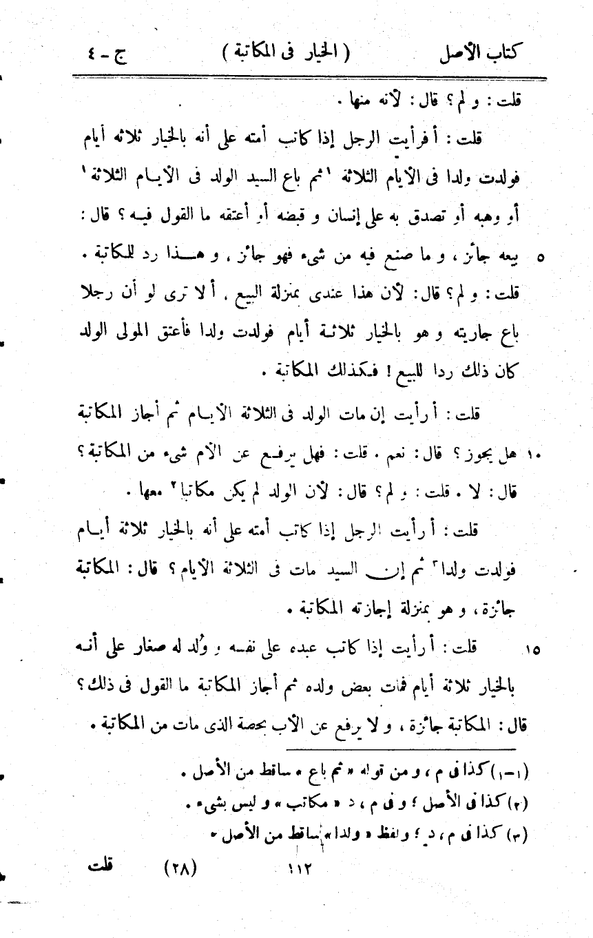 قلت وَلم قَالَ لِأَنَّهُ مِنْهَا قلت أَفَرَأَيْت الرجل إِذا كَاتب أمته على أَنه بِالْخِيَارِ ثَلَاثَة أَيَّام فَولدت ولدا فِي الْأَيَّام الثَّلَاثَة ثمَّ بَاعَ السَّيِّد الْوَلَد فِي الْأَيَّام الثَّلَاثَة أَو وهبه أَو تصدق بِهِ على إِنْسَان وَقَبضه أَو أعْتقهُ مَا القَوْل فِيهِ قَالَ بَيْعه جَائِز وَمَا صنع فِيهِ من شَيْء فَهُوَ جَائِز وَهَذَا رد للمكاتبة قلت وَلم قَالَ لِأَن هَذَا عِنْدِي بِمَنْزِلَة البيع أَلا ترى لَو أَن رجلا بَاعَ جَارِيَته وَهُوَ بِالْخِيَارِ ثَلَاثَة أَيَّام فَولدت ولدا فَأعتق الْمولى الْوَلَد كَانَ ذَلِك ردا للْبيع فَكَذَلِك الْمُكَاتبَة قلت أَرَأَيْت إِن مَاتَ الْوَلَد فِي الثَّلَاثَة الْأَيَّام ثمَّ أجَاز الْمُكَاتبَة هَل يجوز قَالَ نعم قلت فَهَل يرفع عَن الْأُم شَيْء من الْمُكَاتبَة قَالَ لَا قلت وَلم قَالَ لِأَن الْوَلَد لم يكن مكَاتبا مَعهَا قلت أَرَأَيْت الرجل إِذا كَاتب أمته على أَنه بِالْخِيَارِ ثَلَاثَة أَيَّام فَولدت ولدا ثمَّ إِن السَّيِّد مَاتَ فِي الثَّلَاثَة الْأَيَّام قَالَ الْمُكَاتبَة جَائِزَة وَهُوَ بِمَنْزِلَة إِجَازَته الْمُكَاتبَة قلت أَرَأَيْت إِذا كَاتب عَبده على نَفسه وَولد لَهُ صغَار على أَنه بِالْخِيَارِ ثَلَاثَة أَيَّام فَمَاتَ بعض وَلَده ثمَّ أجَاز الْمُكَاتبَة مَا القَوْل فِي ذَلِك قَالَ الْمُكَاتبَة جَائِزَة وَلَا يرفع عَن الْأَب بِحِصَّة الَّذِي مَاتَ من الْمُكَاتبَة