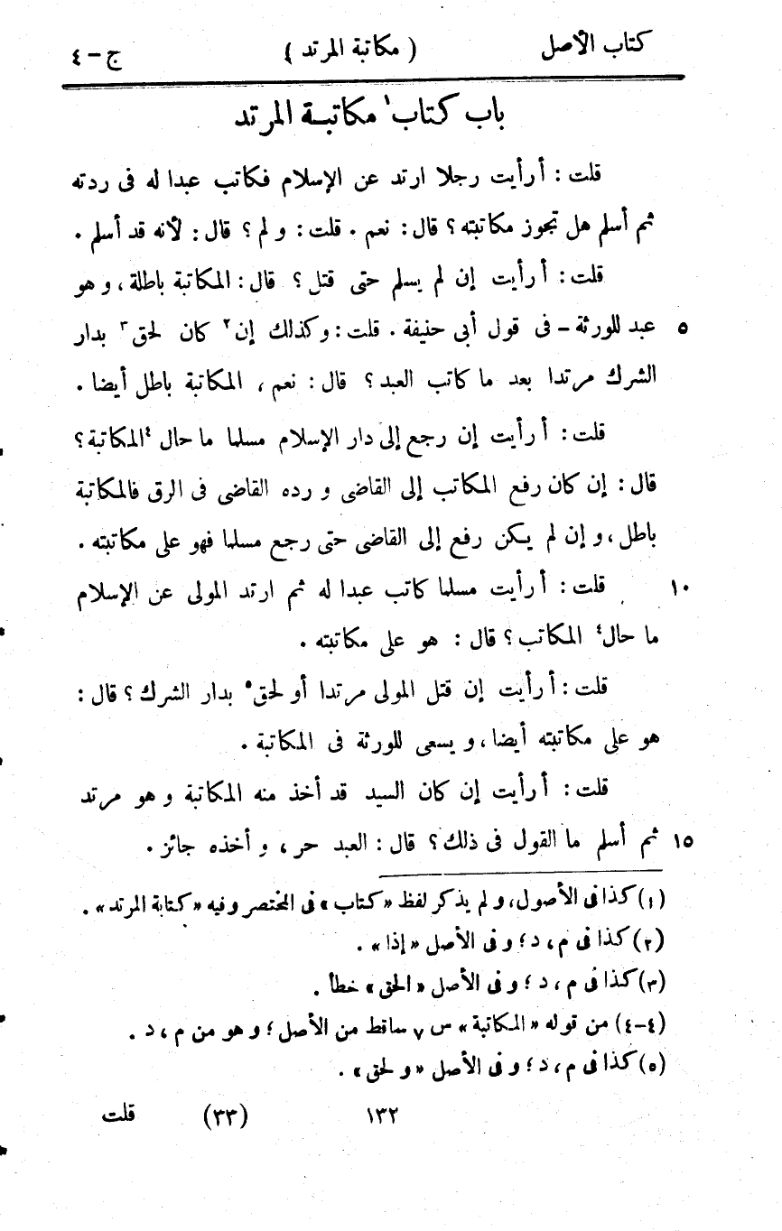 - قلت أَرَأَيْت رجلا ارْتَدَّ عَن الْإِسْلَام فكاتب عبدا لَهُ فِي ردته ثمَّ أسلم هَل تجوز مُكَاتبَته قَالَ نعم قلت وَلم قَالَ لِأَنَّهُ قد أسلم قلت أَرَأَيْت إِن لم يسلم حَتَّى قتل قَالَ الْمُكَاتبَة بَاطِلَة وَهُوَ عبد للْوَرَثَة فِي قَول إبي حنيفَة قلت وَكَذَلِكَ إِن كَانَ لحق بدار الشّرك مُرْتَدا بعد مَا كَاتب العَبْد قَالَ نعم الْمُكَاتبَة بَاطِل أَيْضا قلت أَرَأَيْت إِن رَجَعَ إِلَى دَار الْإِسْلَام مُسلما مَا حَال الْمُكَاتبَة قَالَ إِن كَانَ رفع الْمكَاتب إِلَى القَاضِي ورده القَاضِي فِي الرّقّ فالمكاتبة بَاطِل وَإِن لم يكن رفع إِلَى القَاضِي حَتَّى رَجَعَ مُسلما فَهُوَ على مُكَاتبَته قلت أَرَأَيْت مُسلما كَاتب عبدا لَهُ ثمَّ ارْتَدَّ الْمولى عَن الْإِسْلَام مَا حَال الْمكَاتب قَالَ هُوَ على مُكَاتبَته قلت أَرَأَيْت إِن قتل الْمولى مُرْتَدا أَو لحق بدار الشّرك قَالَ هُوَ على مُكَاتبَته أَيْضا وَيسْعَى للْوَرَثَة فِي الْمُكَاتبَة قلت أَرَأَيْت إِن كَانَ السَّيِّد قد أَخذ مِنْهُ الْمُكَاتبَة وَهُوَ مُرْتَد ثمَّ أسلم مَا القَوْل فِي ذَلِك قَالَ العَبْد حر وَأَخذه جَائِز