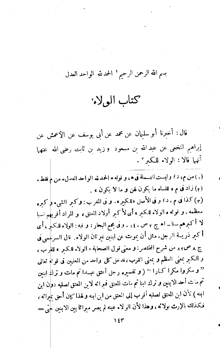 قَالَ أخبرنَا أَبُو سُلَيْمَان عَن مُحَمَّد عَن أبي يُوسُف عَن الْأَعْمَش عَن إِبْرَاهِيم النَّخعِيّ عَن عبد الله بن مَسْعُود وَزيد بن ثَابت رَضِي الله عَنْهُمَا أَنَّهُمَا قَالَا الْوَلَاء للكبر