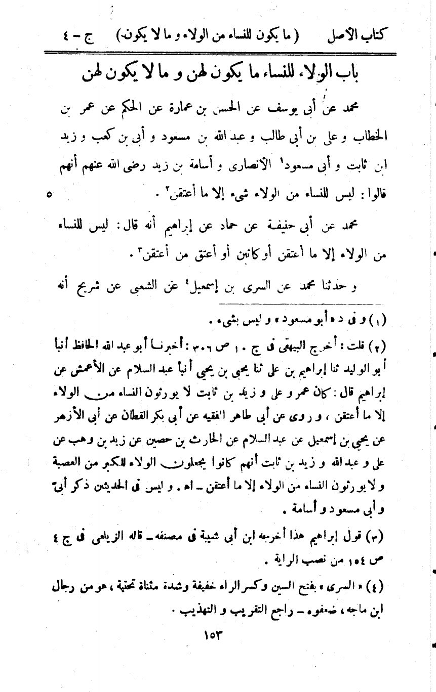 - مُحَمَّد بن أبي يُوسُف عَن الْحسن بن عمَارَة عَن الحكم عَن عمر بن الْخطاب وعَلى بن أبي طَالب وعبد الله بن مَسْعُود وَأبي بن كَعْب وَزيد ابْن ثَابت وابي مَسْعُود الْأنْصَارِيّ وَأُسَامَة بن زيد رَضِي الله عَنْهُم أَنهم قَالُوا لَيْسَ للنِّسَاء من الْوَلَاء شَيْء إِلَّا مَا أعتقن مُحَمَّد عَن أبي حنيفَة عَن حَمَّاد عَن إِبْرَاهِيم أَنه قَالَ لَيْسَ للنِّسَاء من الْوَلَاء إِلَّا مَا أعتقن أَو كاتبن أَو أعتق من أعتقن وَحدثنَا مُحَمَّد عَن السرى بن إِسْمَاعِيل عَن الشّعبِيّ عَن شُرَيْح أَنه