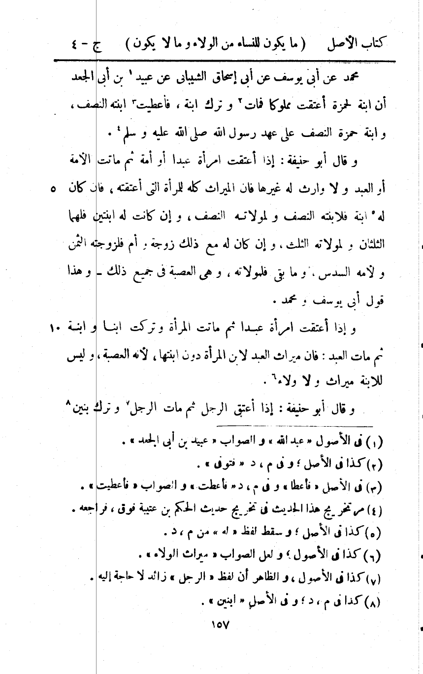 مُحَمَّد عَن أبي يُوسُف عَن أبي إِسْحَاق الشَّيْبَانِيّ عَن عبيد بن أبي الْجَعْد أَنا ابْنة لِحَمْزَة أعتقت مَمْلُوكا فَمَاتَ وَترك ابْنة فَأعْطيت ابْنَته النّصْف وَابْنَة حَمْزَة النّصْف على عهد رَسُول الله صلى الله عَلَيْهِ وَسلم وَقَالَ أَبُو حنيفَة إِذا أعتقت امْرَأَة عبدا أَو أمة ثمَّ مَاتَت الْأمة أَو العَبْد وَلَا وَارِث لَهُ غَيرهَا فان الْمِيرَاث كُله للْمَرْأَة الَّتِي أَعتَقته فان كَانَ لَهُ ابْنة فلابنته النّصْف ولمولاته النّصْف وَإِن كَانَت لَهُ ابْنَتَيْن فَلَهُمَا الثُّلُثَانِ ولمولاته الثُّلُث وَإِن كَانَ لَهُ مَعَ ذَلِك زَوْجَة وَأم فلزوجته الثّمن ولأمه السُّدس وَمَا بَقِي فلمولاته وَهِي الْعصبَة فِي جَمِيع ذَلِك وَهَذَا قَول ابي يُوسُف وَمُحَمّد وَإِذا أعتقت امْرَأَة عبدا ثمَّ مَاتَت الْمَرْأَة وَتركت ابْنا وَابْنَة ثمَّ مَاتَ العَبْد فان مِيرَاث العَبْد لِابْنِ الْمَرْأَة دون ابْنَتهَا لِأَنَّهُ الْعصبَة وَلَيْسَ للابنة مِيرَاث وَلَا وَلَاء وَقَالَ أَبُو حنيفَة إِذا أعتق الرجل ثمَّ مَاتَ الرجل وَترك بَنِينَ