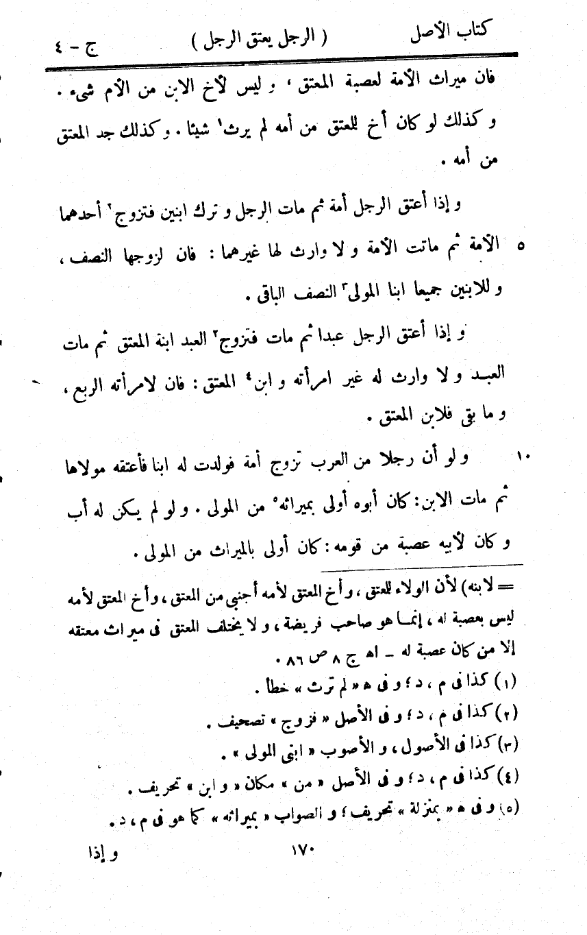 فان مِيرَاث الْأمة لعصبة الْمُعْتق وَلَيْسَ لأخ الابْن من الْأُم شَيْء وَكَذَلِكَ لَو كَانَ أَخ للْمُعْتق من أمه لم يَرث شَيْئا وَكَذَلِكَ جد الْمُعْتق من أمه وَإِذا أعتق الرجل أمة ثمَّ مَاتَ الرجل وَترك ابْنَيْنِ فَتزَوج أَحدهمَا الْأمة ثمَّ مَاتَت الْأمة وَلَا وَارِث لَهَا غَيرهمَا فان لزَوجهَا النّصْف وللابنين جَمِيعًا ابْنا الْمولى النّصْف الْبَاقِي وَإِذا أعتق الرجل عبدا ثمَّ مَاتَ فَتزَوج العَبْد ابْنة الْمُعْتق ثمَّ مَاتَ العَبْد وَلَا وَارِث لَهُ غير امْرَأَته وَابْن الْمُعْتق فان لامْرَأَته الرّبع وَمَا بَقِي فلابن الْمُعْتق وَلَو أَن رجلا من الْعَرَب تزوج أمة فَولدت لَهُ ابْنا فَأعْتقهُ مَوْلَاهَا ثمَّ مَاتَ الابْن كَانَ أَبوهُ أولى بميراثه من الْمولى وَلَو لم يكن لَهُ أَب وَكَانَ لِأَبِيهِ عصبَة من قومه كَانَ أولى بِالْمِيرَاثِ من الْمولى