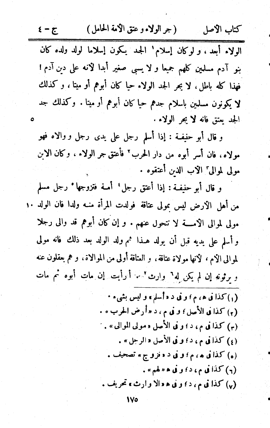 الْوَلَاء أبعد وَلَو كَانَ إِسْلَام الْجد يكون إسلاما لولد وَلَده كَانَ بَنو آدم مُسلمين كلهم جَمِيعًا وَلَا يسبي صَغِير أبدا لِأَنَّهُ على دين آدم فَهَذَا كُله بَاطِل لَا يجر الْجد الْوَلَاء حَيا كَانَ أبوهم أَو مَيتا وَكَذَلِكَ لَا يكونُونَ مُسلمين باسلام جدهم حَيا كَانَ أَبُو هم أَو مَيتا وَكَذَلِكَ جد الْجد يعْتق فانه لَا يجر الْوَلَاء وَقَالَ أَبُو حنيفَة إِذا أسلم رجل على يَدي رجل ووالاه فَهُوَ مَوْلَاهُ فان أسر أَبوهُ من دَار الْحَرْب فَأعتق جر الْوَلَاء وَكَانَ الابْن مولى لموَالِي الْأَب الَّذين أعتقوه وَقَالَ أَبُو حنيفَة إِذا أعتق رجل أمة فَتَزَوجهَا رجل مُسلم من أهل الأَرْض لَيْسَ بمولي عتاقه فَولدت الْمَرْأَة مِنْهُ ولدا فان الْوَلَد مولى لموَالِي الْأمة لَا تتحول عَنْهُم وَإِن كَانَ أبوهم قد والى رجلا وَأسلم على يَدَيْهِ قبل أَن يُولد هَذَا ثمَّ ولد الْوَلَد بعد ذَلِك فانه مولى لموَالِي الْأُم لِأَنَّهَا مولاة عتاقه والعتاقه أولى من الْمُوَالَاة وهم يعْقلُونَ عَنهُ ويرثونه إِن لم يكن لَهُ وَارِث أَرَأَيْت إِن مَاتَ أَبوهُ ثمَّ مَاتَ