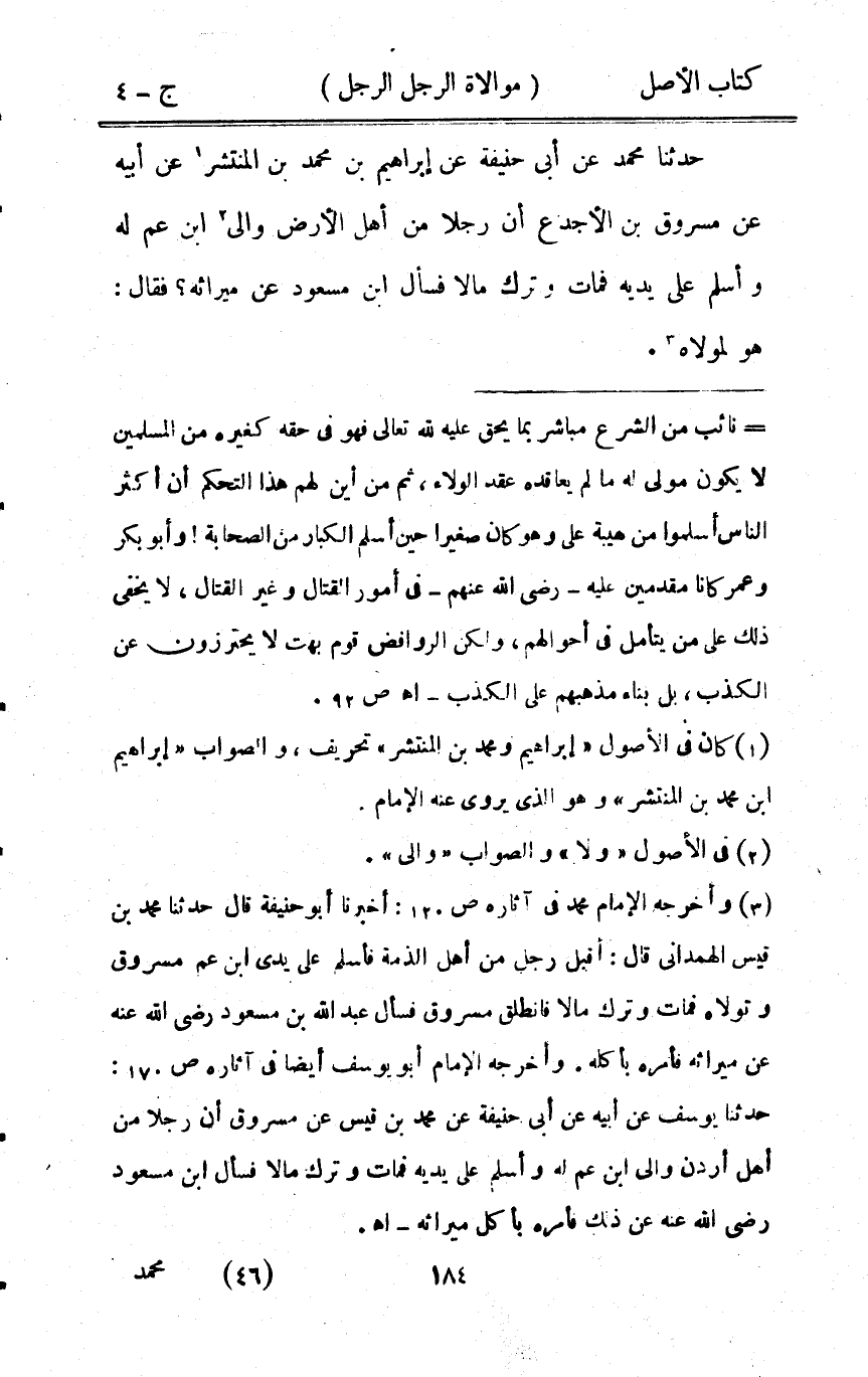 حَدثنَا مُحَمَّد عَن أبي حنيفَة عَن إِبْرَاهِيم بن مُحَمَّد بن الْمُنْتَشِر عَن ابيه عَن مَسْرُوق بن الأجدع أَن رجلا من أهل الأَرْض والى ابْن عَم لَهُ وَأسلم على يَدَيْهِ فَمَاتَ وَترك مَا لَا فَسَأَلَ ابْن مَسْعُود عَن مِيرَاثه فَقَالَ هُوَ لمَوْلَاهُ