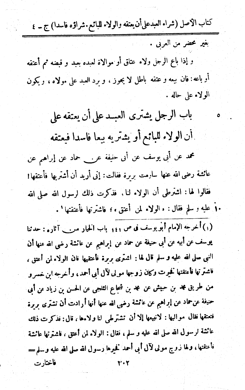 - مُحَمَّد عَن ابي يُوسُف عَن أبي حنيفَة عَن حَمَّاد عَن إِبْرَاهِيم عَن عَائِشَة رَضِي الله عَنْهَا ساومت بَرِيرَة فَقَالَت إِنِّي أُرِيد أَن اشتريها فاعتقها فَقَالُوا لَهَا اشترطي أَن الْوَلَاء لنا فَذكرت ذَلِك لرَسُول الله صلى الله عَلَيْهِ وَسلم فَقَالَ الْوَلَاء لمن أعتق فاشترتها فاعتقتها