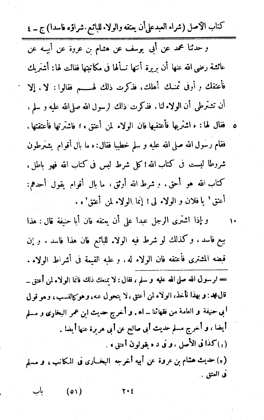 وَحدثنَا مُحَمَّد عَن أبي يُوسُف عَن هِشَام بن عُرْوَة عَن ابيه عَن عَائِشَة رَضِي الله عَنْهَا أَن بَرِيرَة أتتها تسألها فِي مكاتبتها فَقَالَت لَهَا أشتريك فأعتقك وأوفي ثمنك أهلك فَذكرت ذَلِك لَهُم فَقَالُوا لَا إِلَّا أَن تشترطي أَن الْوَلَاء لنا فَذكرت ذَلِك لرَسُول الله صلى الله عَلَيْهِ وَسلم فَقَالَ لَهَا اشتريها فأعتقيها فان الْوَلَاء لمن أعتق فاشترتها فاعتقتها فَقَامَ رَسُول الله صلى الله عَلَيْهِ وَسلم خَطِيبًا فَقَالَ مَا بَال أَقوام يشترطون شُرُوطًا لَيست فِي كتاب الله كل شَرط لَيْسَ فِي كتاب الله فَهُوَ بَاطِل كتاب الله هُوَ أَحَق وَشرط الله أوثق مَا بَال أَقوام يَقُول أحدهم أعتق يافلان وَالْوَلَاء لي إِنَّمَا الْوَلَاء لمن أعتق وَإِذا اشْترى الرجل عبدا على أَن يعتقهُ فَأن ابا حنيفَة قَالَ هَذَا بيع فَاسد وَكَذَلِكَ لَو شَرط فِيهِ الْوَلَاء للْبَائِع فان هَذَا فَاسد وَإِن قَبضه المُشْتَرِي فَأعْتقهُ فان الْوَلَاء لَهُ وَعَلِيهِ الْقيمَة فِي أَشْرَاط الْوَلَاء