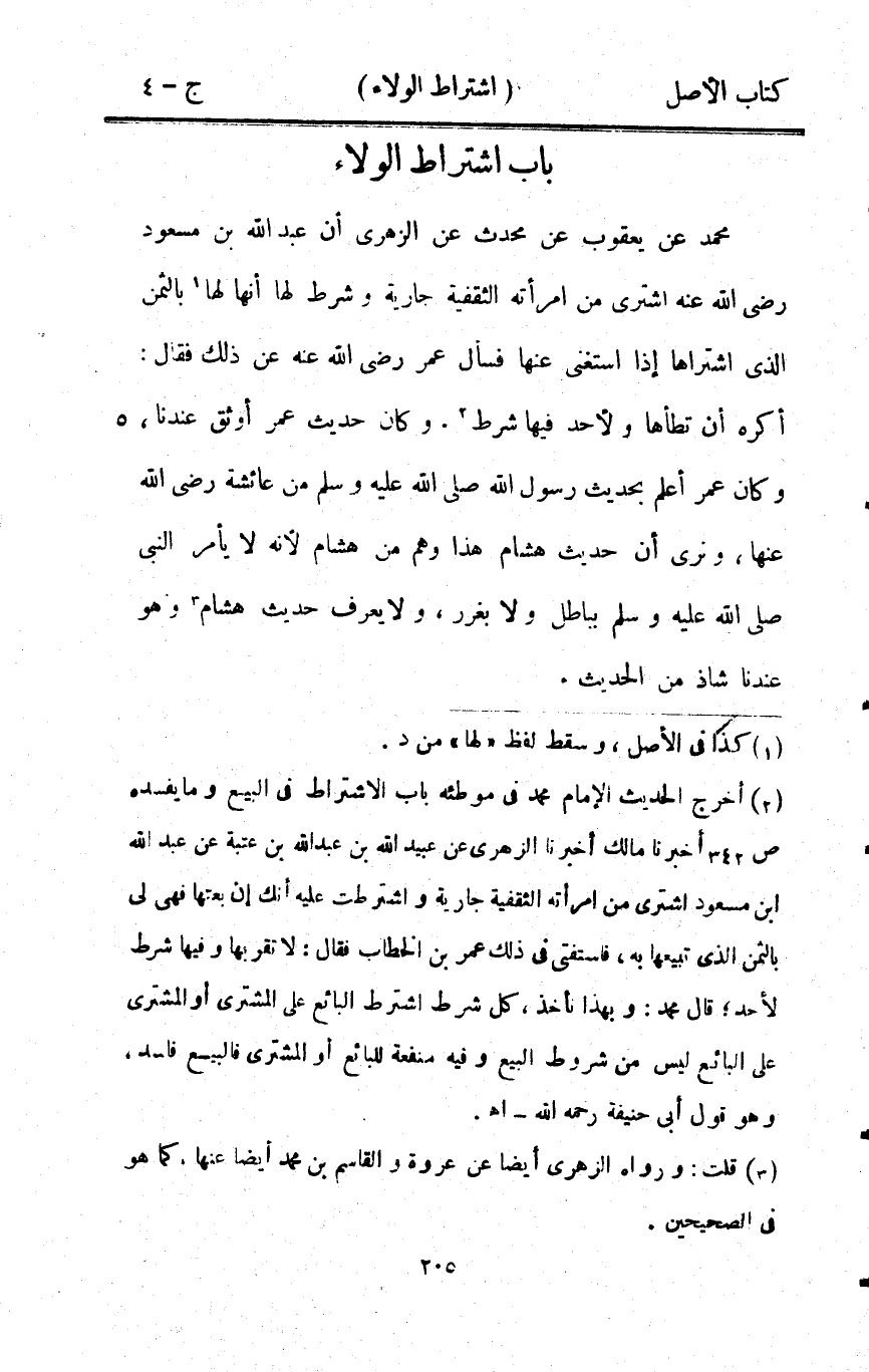 - مُحَمَّد عَن يَعْقُوب عَن مُحدث عَن الزُّهْرِيّ أَن عبد الله بن مَسْعُود رَضِي الله عَنهُ اشْترى من امْرَأَته الثقفية جَارِيَة وَشرط لَهَا أَنَّهَا لَهَا بِالثّمن الَّذِي اشْتَرَاهَا إِذا اسْتغنى عَنْهَا فَسَأَلَ عمر رَضِي الله عَنهُ عَن ذَلِك فَقَالَ أكره أَن تطأها ولأحد فِيهَا شَرط وَكَانَ حَدِيث عمر أوثق عندنَا وَكَانَ عمر أعلم بِحَدِيث رَسُول الله صلى الله عَلَيْهِ وَسلم من عَائِشَة رَضِي الله عَنْهَا ونرى أَن حَدِيث هِشَام هَذَا وهم من هِشَام لِأَنَّهُ لَا يَأْمر النَّبِي صلى الله عَلَيْهِ وَسلم بباطل وَلَا يغرر وَلَا يعرف حَدِيث هِشَام وَهُوَ عندنَا شَاذ من الحَدِيث
