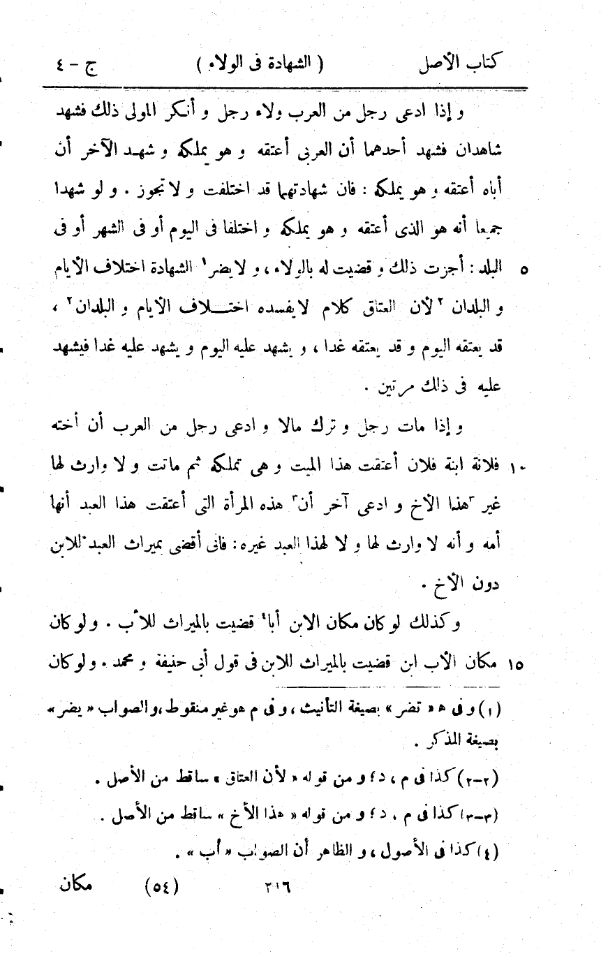 وَإِذا ادّعى رجل من الْعَرَب وَلَاء رجل وَأنكر الْمولى ذَلِك فَشهد شَاهِدَانِ فَشهد أَحدهمَا أَن الْعَرَبِيّ أعْتقهُ وَهُوَ يملكهُ وَشهد الآخر أَن أَبَاهُ أعْتقهُ وَهُوَ يملكهُ فان شَهَادَتهمَا قد اخْتلفت وَلَا تجوز وَلَو شَهدا جَمِيعًا أَنه هُوَ الَّذِي أعْتقهُ وَهُوَ يملكهُ وَاخْتلفَا فِي الْيَوْم أَو فِي الشَّهْر أَو فِي الْبَلَد أجزت ذَلِك وقضيت لَهُ بِالْوَلَاءِ وَلَا يضر الشَّهَادَة اخْتِلَاف الْأَيَّام والبلدان لِأَن الْعتاق كَلَام لَا يُفْسِدهُ اخْتِلَاف الْأَيَّام والبلدان قد يعتقهُ الْيَوْم وَقد يعتقهُ غَدا وَيشْهد عَلَيْهِ الْيَوْم وَيشْهد عَلَيْهِ غَدا فَيشْهد عَلَيْهِ فِي ذَلِك مرَّتَيْنِ وَإِذا مَاتَ رجل وَترك مَالا وَادّعى رجل من الْعَرَب أَن أُخْته فُلَانَة ابْنة فلَان أعتقت هَذَا الْمَيِّت وَهِي تملكه ثمَّ مَاتَت وَلَا وَارِث لَهَا غير هَذَا الْأَخ وَادّعى آخر أَن هَذِه الْمَرْأَة الَّتِي أعتقت هَذَا العَبْد أَنَّهَا أمه وَأَنه لَا وَارِث لَهَا وَلَا لهَذَا العَبْد غَيره فَانِي اقضي بميراث العَبْد للِابْن دون الْأَخ