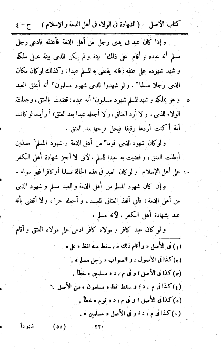 وَإِذا كَانَ عبد فِي يَدي رجل من أهل الذِّمَّة فَأعْتقهُ فَادّعى رجل مُسلم أَنه عَبده وَأقَام على ذَلِك بَيِّنَة وَلم يكن للذِّمِّيّ بَيِّنَة على ملكه وَشهد شُهُوده على عتقه فانه يقْضِي بِهِ للْمُسلمِ عبدا وَكَذَلِكَ لَو كَانَ مَكَان الذِّمِّيّ رجلا مُسلما وَلَو شهدُوا للذِّمِّيّ شُهُود مُسلمُونَ أَنه أعتق العَبْد وَهُوَ يملكهُ وَشهد للْمُسلمِ شُهُود مُسلمُونَ أَنه عَبده قضيت بِالْعِتْقِ وَجعلت الْوَلَاء للذِّمِّيّ وَلَا أرد الْعتاق وَلَا أجعله عبدا بعد الْعتْق أَرَأَيْت لَو كَانَت أمة أَكنت أردهَا رَقِيقا فَيحل فرجهَا بعد الْعتْق وَلَو كَانَ شُهُود الذِّمِّيّ قوما من أهل الذِّمَّة وشهود الْمُسلم مُسلمين أبطلت الْعتْق وقضيت بِهِ عبدا للْمُسلمِ لِأَنِّي لَا أُجِيز شَهَادَة أهل الْكفْر على أهل الْإِسْلَام وَلَو كَانَ العَبْد فِي هَذِه الْحَالة مسملما أَو كَافِر فَهُوَ سَوَاء