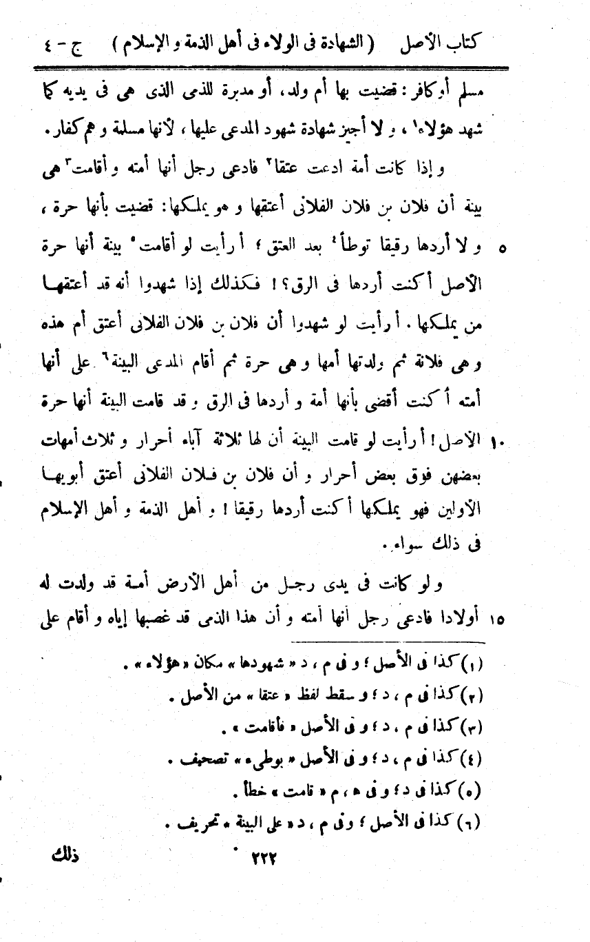 وَإِذا كَانَت أمة ادَّعَت عتقا فَادّعى رجل أَنَّهَا أمته وأقامت هِيَ بَيِّنَة أَن فلَان بن فلَان الْفُلَانِيّ أعْتقهَا وَهُوَ يملكهَا قضيت بِأَنَّهَا حرَّة وَلَا أردهَا رَقِيقا تُوطأ بعد الْعتْق أَرَأَيْت لَو أَقَامَت بَيِّنَة أَنَّهَا حرَّة الأَصْل أَكنت أردهَا فِي الرّقّ فَكَذَلِك إِذا شهدُوا أَنه قد أعْتقهَا من يملكهَا أَرَأَيْت لَو شهدُوا أَن فلَان بن فلَان الْفُلَانِيّ أعتق أم هَذِه وَهِي فُلَانَة ثمَّ ولدتها أمهَا وَهِي حرَّة ثمَّ أَقَامَ الْمُدَّعِي الْبَيِّنَة على أَنَّهَا أمته أَكنت أَقْْضِي بِأَنَّهَا أمة وأردها فِي الرّقّ وَقد قَامَت الْبَيِّنَة أَنَّهَا حرَّة الأَصْل أَرَأَيْت لَو قَامَت الْبَيِّنَة أَن لَهَا ثَلَاثَة آبَاء أَحْرَار وَثَلَاث أُمَّهَات بَعضهنَّ فَوق بعض أَحْرَار وَأَن فلَان بن فلَان الْفُلَانِيّ أعتق أَبَوَيْهَا الْأَوَّلين فَهُوَ يملكهَا أَكنت أردهَا رَقِيقا وَأهل الذِّمَّة وَأهل الْإِسْلَام فِي ذَلِك سَوَاء