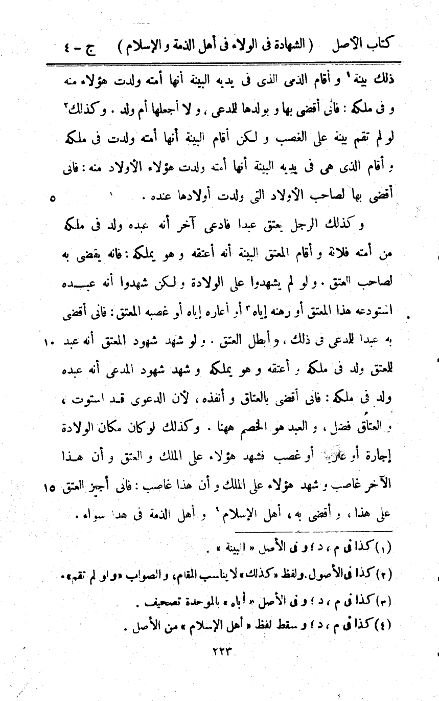 ذَلِك بَيِّنَة وَأقَام الذِّمِّيّ الَّذِي فِي يَدَيْهِ الْبَيِّنَة أَنَّهَا أمته ولدت هَؤُلَاءِ مِنْهُ وَفِي ملكه فَانِي أَقْْضِي بهَا وَبِوَلَدِهَا للمدجي وَلَا أجعلها أم ولد وَكَذَلِكَ لَو لم تقم بَيِّنَة على الْغَصْب وَلَكِن اقام الْبَيِّنَة أَنَّهَا أمته ولدت فِي ملكه وَأقَام الَّذِي هِيَ فِي يَدَيْهِ الْبَيِّنَة أنهالا أمته ولدت هَؤُلَاءِ الْأَوْلَاد مِنْهُ فَانِي أَقْْضِي بهَا لصَاحب الْأَوْلَاد الَّتِي ولدت أَوْلَادهَا عِنْده وَكَذَلِكَ الرجل يعْتق عبدا فَادّعى آخر أَنه عَبده ولد فِي ملكه من أمته فُلَانَة واقام الْمُعْتق الْبَيِّنَة أَنه أعْتقهُ وَهُوَ يملكهُ فانه يقْضِي بِهِ لصَاحب الْعتْق وَلَو لم يشْهدُوا على الْولادَة وَلَكِن شهدُوا أَنه عَبده استودعه هَذَا الْمُعْتق أَو رَهنه إِيَّاه أَو أَعَارَهُ إِيَّاه أَو غصبه الْمُعْتق فَانِي أَقْْضِي بِهِ عبدا للْمُدَّعِي فِي ذَلِك وأبطل الْعتْق وَلَو شهد شُهُود الْمُعْتق أَنه عبد للْمُعْتق ولد فِي ملكه وَأعْتقهُ وَهُوَ يملكهُ وَشهد شُهُود الْمُعْتق أَنه عبد للْمُعْتق ولد فِي ملكه وَأعْتقهُ وَهُوَ يملكهُ وَشهد شُهُود الْمُدَّعِي أَنه عَبده ولد فِي ملكه فَانِي أَقْْضِي بالعتاق وأنفذه لِأَن الدَّعْوَى قد اسْتَوَت وَالْعتاق فضل وَالْعَبْد هُوَ الْخصم هَهُنَا وَكَذَلِكَ لَو كَانَ مَكَان الْولادَة إِجَارَة أَو عَارِية أَو غصب فَشهد هَؤُلَاءِ على الْملك وَالْعِتْق وَأَن هَذَا الآخر غَاصِب وَشهد هَؤُلَاءِ على الْملك وَأَن هَذَا غَاصِب فَانِي أُجِيز الْعتْق على هَذَا وأقضي بِهِ أهل الْإِسْلَام وَأهل الذِّمَّة فِي هَذَا سَوَاء