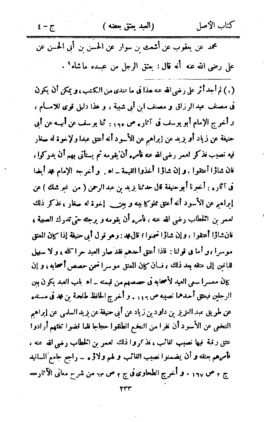 مُحَمَّد عَن يَعْقُوب عَن أَشْعَث بن سوار عَن الْحسن بن أبي الْحسن عَن على رَضِي الله عَنهُ أَنه قَالَ يعْتق الرجل من عَبده مَا شَاءَ