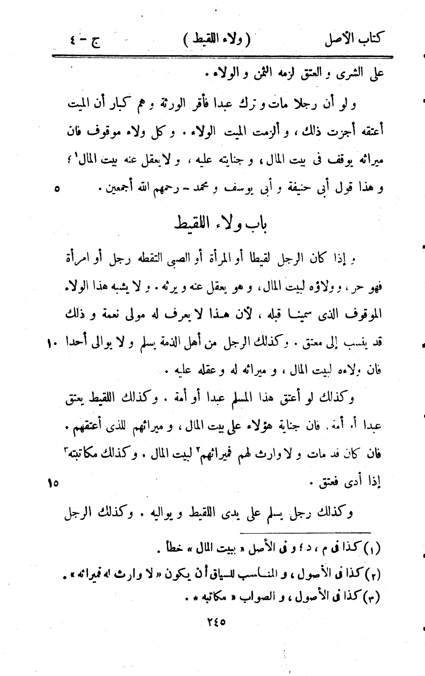 - وَإِذا كَانَ الرجل لقيطا أَو الْمَرْأَة أَو الصَّبِي التقطه رجل أَو امْرَأَة فَهُوَ حر وَوَلَاؤُهُ لبيت المَال وَهُوَ يعقل عَنهُ ويرثه وَلَا يشبه هَذَا الْوَلَاء الْمَوْقُوف الَّذِي سمينا قبله لِأَن هَذَا لَا يعرف لَهُ مولى نعْمَة وَذَلِكَ قد ينْسب إِلَى مُعتق وَكَذَلِكَ الرجل من أهل الذِّمَّة يسلم وَلَا يوالي أحدا فان ولاءه لبيت المَال وميراثه لَهُ وعقله عَلَيْهِ وَكَذَلِكَ لَو أعتق هَذَا الْمُسلم عبدا أَو أمة وَكَذَلِكَ اللَّقِيط يعْتق عبدا أَو أمة فان جِنَايَة هَؤُلَاءِ على بَيت المَال وميراثهم للَّذي أعتقهم فان كَانَ قد مَاتَ وَلَا وَارِث لَهُم فميراثهم لبيت المَال وَكَذَلِكَ مُكَاتبَته إِذا أدّى فَعتق وَكَذَلِكَ رجل يسلم على يَدي اللَّقِيط ويواليه وَكَذَلِكَ الرجل