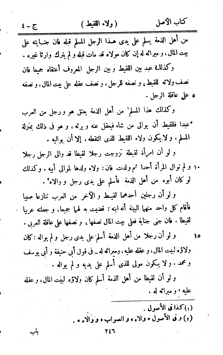 من أهل الذِّمَّة يسلم على يَدي هَذَا الرجل الْمُسلم قبله فان جِنَايَته على بَيت المَال وميراثه لَهُ إِن كَانَ مَوْلَاهُ قد مَاتَ قبله وَلم يتْرك وَارِثا غَيره وَكَذَلِكَ عبد بَين اللَّقِيط وَبَين الرجل الْمَعْرُوف أعتقاه جَمِيعًا فان نصف ولائه للقيط وَنصفه للرجل وَنصف عقله على بَيت المَال وَنصفه على عَاقِلَة الرجل وَكَذَلِكَ هَذَا الْمُسلم من أهل الذِّمَّة يعْتق هُوَ وَرجل من الْعَرَب عبدا فللقيط أَن يوالي من شَاءَ فيعقل عَنهُ ويرثه وَهُوَ فِي ذَلِك بِمَنْزِلَة الْمُسلم وَلَا يكون وَلَاء اللَّقِيط للَّذي التقطه إِلَّا أَن يواليه وَلَو أَن امْرَأَة لقيطة تزوجت رجلا لقيطا قد والى الرجل رجلا وَلم توال الْمَرْأَة أحدا ثمَّ ولدت فان وَلَاء وَلَدهَا لموَالِي ابيه وَكَذَلِكَ لَو كَانَ أَبوهُ من أهل الذِّمَّة فَأسلم على يَدي رجل ووالاه وَلَو أَن رجلَيْنِ أَحدهمَا لَقِيط وَالْآخر من الْعَرَب تنَازعا صَبيا فَأَقَامَ كل وَاحِد مِنْهُمَا الْبَيِّنَة أَنه ابْنه قضيت بِهِ لَهما جَمِيعًا وَجَعَلته عَرَبيا لقيطا فان جنى جِنَايَة فعلى بَيت المَال نصفهَا وَنِصْفهَا على عَاقِلَة الْعَرَبِيّ وَلَو أَن رجلا من أهل الذِّمَّة اسْلَمْ على يَدي رجل وَلم يواله كَانَ وَلَاؤُه لبيت المَال وعقله عَلَيْهِ وميراثه لَهُ فِي قَول ابي حنيفَة وابي يُوسُف وَمُحَمّد وَلَا يكون مولى للَّذي أسلم على يَدَيْهِ وَلم يواله