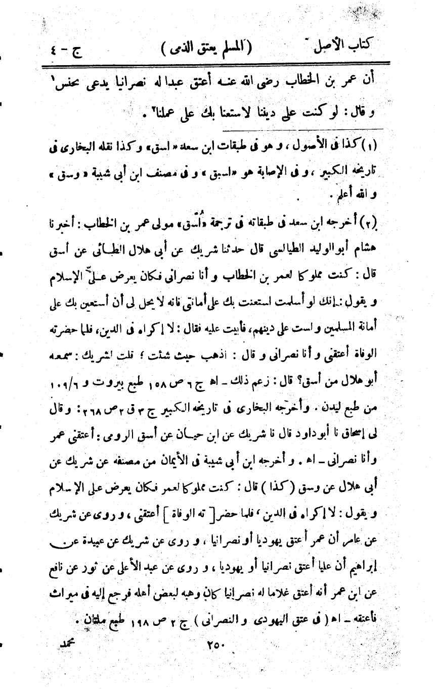 أَن عمر بن الْخطاب رَضِي الله عَنهُ أعتق عبدا لَهُ نَصْرَانِيّا يدعى نحنس وَقَالَ لَو كَانَت على ديننَا لَا ستعنا بك على عَملنَا