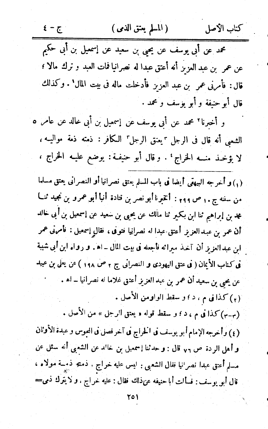 مُحَمَّد عَن أبي يُوسُف عَن يحيى بن سعيد عَن إِسْمَعِيل بن أبي حَكِيم عَن عمر بن عبد الْعَزِيز أَنه أعتق عبدا لَهُ نَصْرَانِيّا فَمَاتَ العَبْد وَترك مَالا قَالَ فَأمرنِي عمر بن عبد الْعَزِيز فأدخلت مَاله فِي بَيت المَال وَكَذَلِكَ قَالَ أَبُو حنيفَة وَأَبُو يُوسُف وَمُحَمّد وَأخْبرنَا مُحَمَّد عَن ابي يُوسُف عَن إِسْمَعِيل بن ابي خَالِد عَن عَامر الشّعبِيّ أَنه قَالَ فِي الرجل يعْتق الرجل الْكَافِر ذمَّته ذمَّة موَالِيه لَا يُؤْخَذ مِنْهُ الْخراج وَقَالَ أَبُو حنيفَة يوضع عَلَيْهِ الْخراج