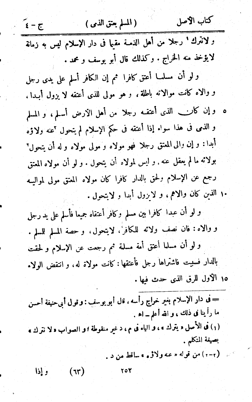 وَلَا نَتْرُك رجلا من أهل الذِّمَّة مُقيما فِي دَار الْإِسْلَام لَيْسَ بِهِ زمانة لَا يُؤْخَذ مِنْهُ الْخراج وَكَذَلِكَ قَالَ أَبُو يُوسُف وَمُحَمّد وَلَو أَن مُسلما أعتق كَافِرًا ثمَّ إِن الْكَافِر اسْلَمْ على يَدي رجل ووالاه كَانَت موالاته بَاطِلَة وَهُوَ مولى للَّذي أعْتقهُ لَا يَزُول أبدا وَإِن كَانَ الَّذِي أعْتقهُ رجلا من أهل الأَرْض أسلم وَالْمُسلم وَالذِّمِّيّ فِي هَذَا سَوَاء إِذا أعْتقهُ فِي حكم الْإِسْلَام لم يتَحَوَّل عَنهُ وَلَاؤُه ابدا وَإِن والى الْمُعْتق رجلا فَهُوَ مَوْلَاهُ وَمولى مَوْلَاهُ وَله أَن يتَحَوَّل بولائه مَا لم يعقل عَنهُ وَلَيْسَ لمَوْلَاهُ أَن يتَحَوَّل وَلَو أَن مَوْلَاهُ الْمُعْتق رَجَعَ عَن الْإِسْلَام وَلحق بِالدَّار كَافِرًا كَانَ مَوْلَاهُ الْمُعْتق مولى لمواليه الَّذِي كَانَ والاهم وَلَا يَزُول أبدا وَلَا يتَحَوَّل وَلَو أَن عبدا كَافِرًا بَين مُسلم وكافرا أعتقاه جَمِيعًا فَاسْلَمْ على يَد رجل ووالاه فان نصف ولائه للْكَافِرِ لَا يتَحَوَّل وَحِصَّة الْمُسلم للْمُسلمِ وَلَو أَن مُسلما أعتق أمة مسلمة ثمَّ رجعت عَن الْإِسْلَام وَلَحِقت بِالدَّار فسبيت فاشتراها رجل فَأعْتقهَا كَانَت مولاة لَهُ وانتقض الْوَلَاء الأول للرق الَّذِي حدث فِيهَا