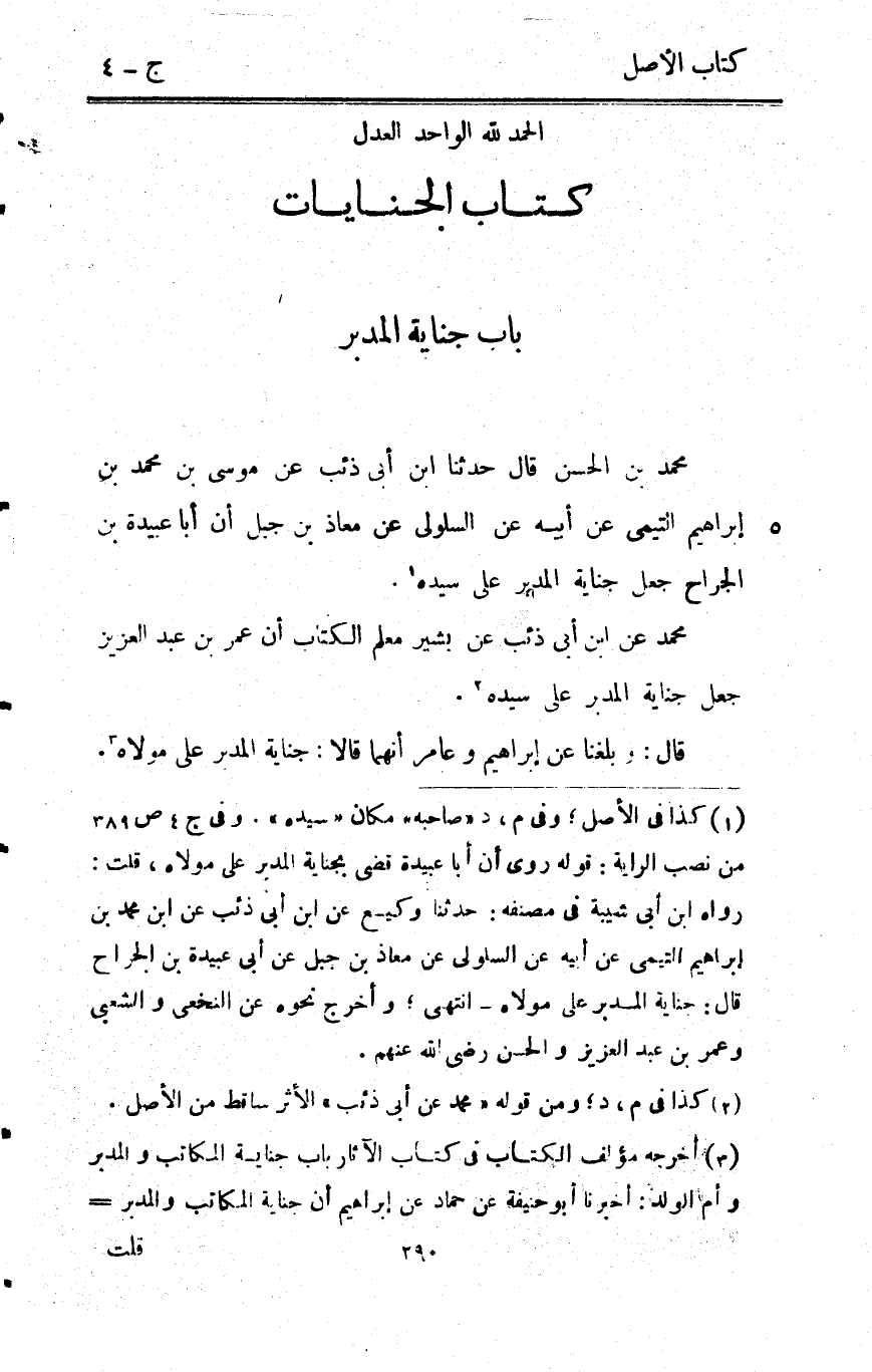 - مُحَمَّد بن الْحسن قَالَ حَدثنَا ابْن ابي ذِئْب عَن مُوسَى بن مُحَمَّد بن إِبْرَاهِيم التَّيْمِيّ عَن أَبِيه عَن السلولى عَن معَاذ بن جبل أَن ابا عُبَيْدَة بن الْجراح جعل جِنَايَة الْمُدبر على سَيّده مُحَمَّد عَن أبن ابي ذِئْب عَن بشير معلم الْكتاب أَن عمر بن عبد الْعَزِيز جعل جِنَايَة الْمُدبر على سَيّده قَالَ وبلغنا عَن إِبْرَاهِيم وعامر أَنَّهُمَا قَالَا جِنَايَة الْمُدبر على مَوْلَاهُ