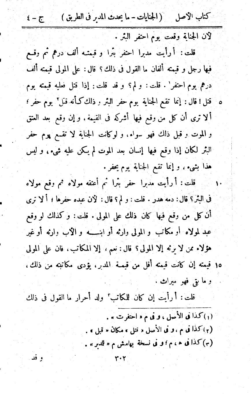 لِأَن الْجَنَابَة وَقعت يَوْم احتفر الْبِئْر قلت أَرَأَيْت مُدبرا احتفر بِئْرا وَقِيمَته ألف دِرْهَم ثمَّ وَقع فِيهَا رجل وَقِيمَته أَلفَانِ مَا القَوْل فِي ذَلِك قَالَ على الْمولى قِيمَته ألف دِرْهَم يَوْم احتفر قلت وَلم وَقد قلت إِذا قتل فَعَلَيهِ قِيمَته يَوْم قبل قَالَ إِنَّمَا تقع الْجِنَايَة يَوْم حفر الْبِئْر وَذَلِكَ كَأَنَّهُ قبل يَوْم حفر أَلا ترى أَن كل من وَقع فِيهَا أشركه فِي الْقيمَة وَإِن وَقع بعد الْعتْق وَالْمَوْت وَقبل ذَلِك فَهُوَ سَوَاء وَلَو كَانَت الْجِنَايَة لَا تقع يَوْم حفر الْبِئْر لَكَانَ إِذا وَقع فِيهَا إِنْسَان بعد الْمَوْت لم يكن عَلَيْهِ شَيْء وَلَيْسَ هَذَا بِشَيْء وَإِنَّمَا تقع الْجِنَايَة يَوْم يحْفر قلت أَرَأَيْت مُدبرا حفر بِئْرا ثمَّ أعْتقهُ مَوْلَاهُ ثمَّ وَقع مَوْلَاهُ فِي الْبِئْر قَالَ دَمه هدر قلت وَلم قَالَ لِأَن عَبده حفرهَا أَلا ترى أَن كل من وَقع فِيهَا كَانَ ذَلِك على الْمولى قلت وَكَذَلِكَ لَو وَقع عبد لمَوْلَاهُ أَو مكَاتب وَالْمولى وَارثه أَو ابْنه وَالْأَب وَارثه أَو غير هَؤُلَاءِ مِمَّن لَا يَرِثهُ إِلَّا الْمولى قَالَ نعم إِلَّا الْمكَاتب فان على الْمولى قِيمَته إِن كَانَت قِيمَته أقل من قيمَة الْمُدبر يُؤَدِّي مُكَاتبَته من ذَلِك وَمَا بَقِي فَهُوَ مِيرَاث قلت أَرَأَيْت إِن كَانَ للْمكَاتب ولد أَحْرَار مَا القَوْل فِي ذَلِك