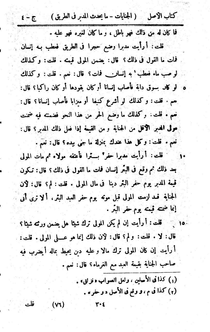 قلت وكل هَذَا عنْدك بِمَنْزِلَة مَا جنى بِيَدِهِ قَالَ نعم قلت أَرَأَيْت مُدبرا حفر بِئْرا فَأعْتقهُ مَوْلَاهُ ثمَّ مَاتَ الْمولى بعد ذَلِك ثمَّ وَقع فِي الْبِئْر إِنْسَان فَمَاتَ مَا القَوْل فِي ذَلِك قَالَ تكون قيمَة الْمُدبر يَوْم حفر الْبِئْر دينا فِي مَال الْمولى قلت لم قَالَ لِأَن الْجِنَايَة قد لَزِمت الْمولى قبل مَوته يَوْم حفر العَبْد الْبِئْر أَلا ترى أَنِّي إِنَّمَا ضمنته قِيمَته يَوْم حفر الْبِئْر قلت أَرَأَيْت إِن لم يكن الْمولى ترك شَيْئا هَل يضمن ورثته شَيْئا قَالَ لَا قلت وَلم قَالَ لِأَن ذَلِك إِنَّمَا هُوَ على الْمولى قلت أَرَأَيْت إِن كَانَ الْمولى ترك مَالا وَعَلِيهِ دين يُحِيط بِمَالِه أيضرب فِيهِ صَاحب الْجِنَايَة بِقِيمَة العَبْد مَعَ الْغُرَمَاء قَالَ نعم