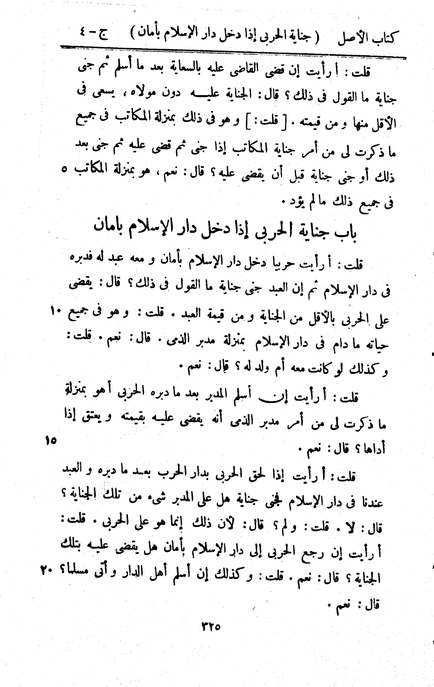 - قلت أَرَأَيْت حَرْبِيّا دخل دَار الْإِسْلَام بِأَمَان وَمَعَهُ عبد لَهُ فدبره فِي دَار الْإِسْلَام ثمَّ إِن العَبْد جنى جِنَايَة مَا القَوْل فِي ذَلِك قَالَ يقْضِي على الْحَرْبِيّ بِالْأَقَلِّ من الْجِنَايَة وَمن قيمَة العَبْد قلت وَهُوَ فِي جَمِيع حَيَاته مَا دَامَ فِي دَار الْإِسْلَام بِمَنْزِلَة مُدبر الذِّمِّيّ قَالَ نعم قلت وَكَذَلِكَ لَو كَانَت مَعَه أم ولد لَهُ قَالَ نعم