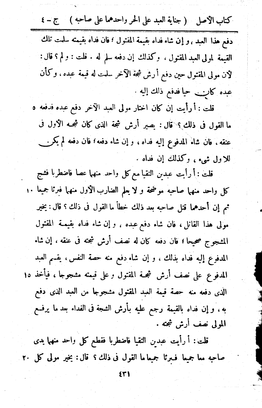 قلت أَرَأَيْت عَبْدَيْنِ التقيا مَعَ كل وَاحِد مِنْهُمَا عَصا فاضطربا فشج كل وَاحِد مِنْهُمَا صَاحبه مُوضحَة وَلَا يعلم الضَّارِب الأول مِنْهُمَا فبرئا جَمِيعًا ثمَّ إِن أَحدهمَا قتل صَاحبه بعد ذَلِك خطأ مَا القَوْل فِي ذَلِك قَالَ يُخَيّر مولى هَذَا الْقَاتِل فان شَاءَ دفع عَبده وَإِن شَاءَ فدَاه بِقِيمَة الْمَقْتُول المشجوج صَحِيحا فان دَفعه كَانَ لَهُ نصف أرش شجته فِي عُنُقه إِن شَاءَ الْمَدْفُوع إِلَيْهِ فدَاه بذلك وَإِن شَاءَ فدع مِنْهُ حِصَّة النَّفس يقسم العَبْد الْمَدْفُوع على نصف أرش شجه الْمَقْتُول وعَلى قِيمَته مشجوجا فَيَأْخُذ الَّذِي دَفعه مِنْهُ حِصَّة قيمَة العَبْد الْمَقْتُول مشجوجا من العَبْد الَّذِي دفع بِهِ وَإِن فدَاه بِالْقيمَةِ رَجَعَ عَلَيْهِ بِأَرْش الشَّجَّة فِي الْفِدَاء بعد مَا يرفع الْمولى نصف أرش شجته قلت أَرَأَيْت عَبْدَيْنِ التقيا فاضطربا فَقطع كل وَاحِد مِنْهُمَا يَدي صَاحبه مَعًا جَمِيعًا فبرئا جَمِيعًا مَا القَوْل فِي ذَلِك قَالَ يُخَيّر مولى كل