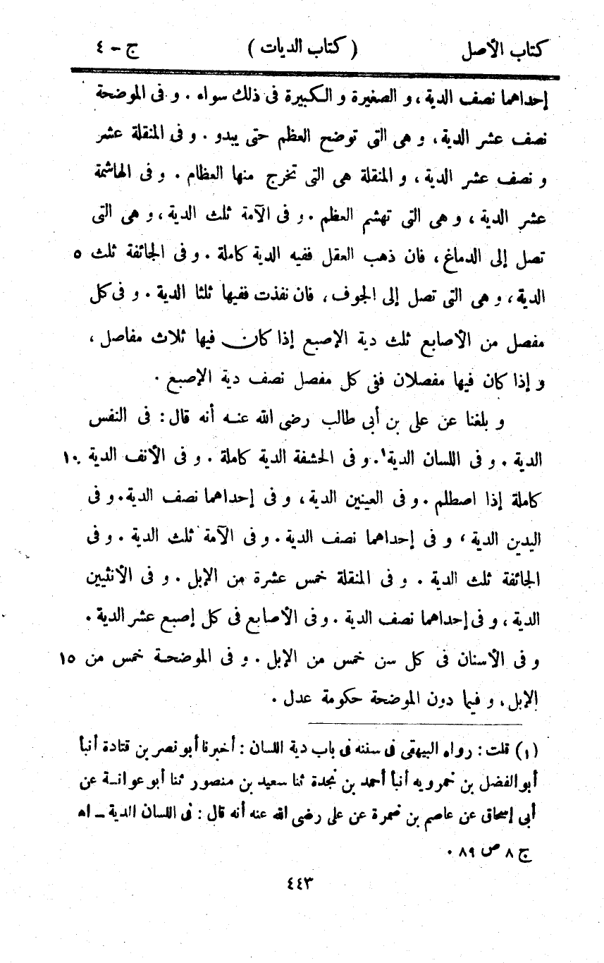 وبلغنا عَن عَليّ بن أبي طَالب رَضِي الله عَنهُ أَنه قَالَ فِي النَّفس الدِّيَة وَفِي اللِّسَان الدِّيَة وَفِي الْحَشَفَة الدِّيَة كَامِلَة وَفِي الْأنف الدِّيَة كَامِلَة إِذا اصطلم وَفِي الْعَينَيْنِ الدِّيَة وَفِي إِحْدَاهمَا نصف الدِّيَة وَفِي الْيَدَيْنِ الدِّيَة وَفِي إِحْدَاهمَا نصف الدِّيَة وَفِي الآمة ثلث الدِّيَة وَفِي الْجَائِفَة ثلث الدِّيَة وَفِي المنقلة خمس عشرَة من الْإِبِل وَفِي الْأُنْثَيَيْنِ الدِّيَة وَفِي إِحْدَاهمَا نصف الدِّيَة وَفِي الْأَصَابِع فِي كل إِصْبَع عشر الدِّيَة وَفِي الْأَسْنَان فِي كل سنّ خمس من الْإِبِل وَفِي الْمُوَضّحَة خمس من الْإِبِل وَفِيمَا دون الْمُوَضّحَة حُكُومَة عدل