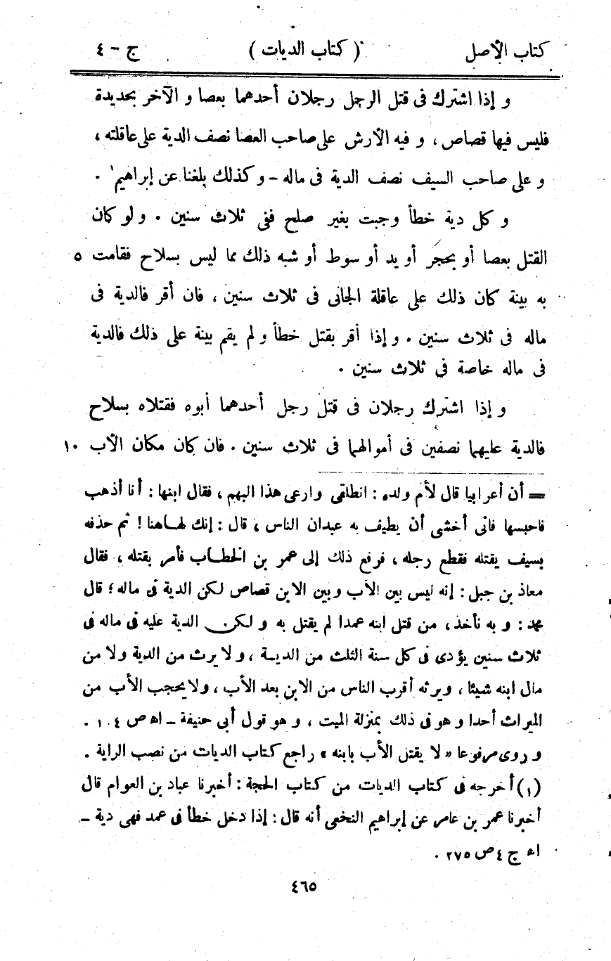 وَإِذا اشْترك فِي قتل الرجل رجلَانِ أَحدهمَا بَعْضًا وَالْآخر بحديدة فَلَيْسَ فِيهَا قصاص وَفِيه الْأَرْش على صَاحب الْعَصَا نصف الدِّيَة على عَاقِلَته وعَلى صَاحب السَّيْف نصف الدِّيَة فِي مَاله وَكَذَلِكَ بلغنَا عَن إِبْرَاهِيم وكل دِيَة خطأ وَجَبت بِغَيْر صلح فَفِي ثَلَاث سِنِين وَلَو كَانَ الْقَتْل بَعْضًا أَو بِحجر أَو يَد أَو سَوط أَو شبه ذَلِك مِمَّا لَيْسَ بسلاح فَقَامَتْ بِهِ بَيِّنَة كَانَ ذَلِك على عَاقِلَة الْجَانِي فِي ثَلَاث سِنِين فان أقرّ فَالدِّيَة فِي مَاله فِي ثَلَاث سِنِين وَإِذا أقرّ بقتل خطأ وَلم يقم بَيِّنَة على ذَلِك فَالدِّيَة فِي مَاله خَاصَّة فِي ثَلَاث سِنِين وَإِذا اشْترك رجلَانِ فِي قتل رجل أَحدهمَا أَبوهُ فقتلاه بسلاح فَالدِّيَة عَلَيْهِمَا نِصْفَيْنِ فِي أموالهما فِي ثَلَاث سِنِين فان كَانَ مَكَان الْأَب