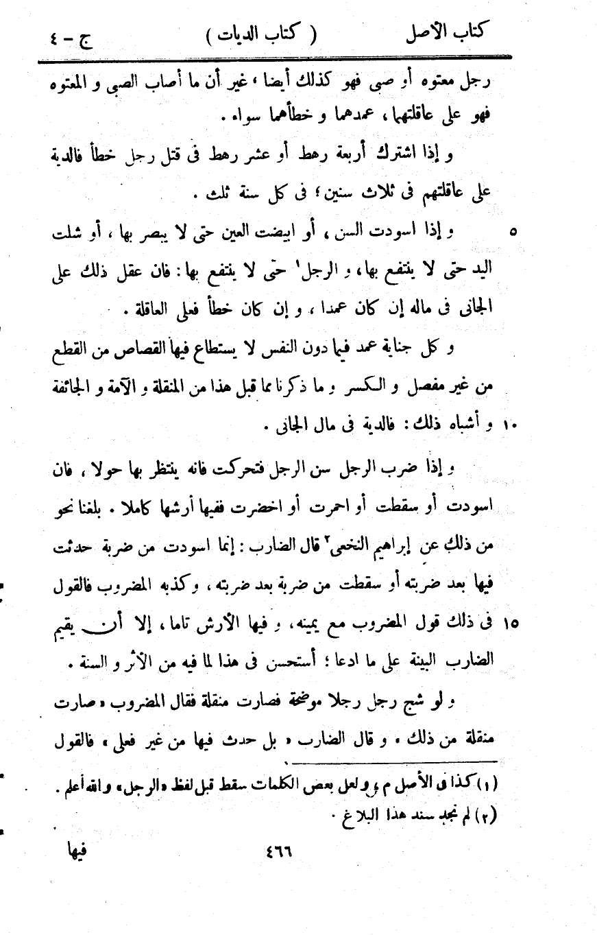 رجل معتوه أَو صبي فَهُوَ كَذَلِك ايضا غير أَن مَا أصَاب الصَّبِي وَالْمَعْتُوه فَهُوَ على عاقلتهما عمدهما وخطأهما سَوَاء وَإِذا اشْترك أَرْبَعَة رَهْط أَو عشر رَهْط فِي قتل رجل خطأ فَالدِّيَة على عاقلتهم فِي ثَلَاث سِنِين فِي كل سنة ثلث