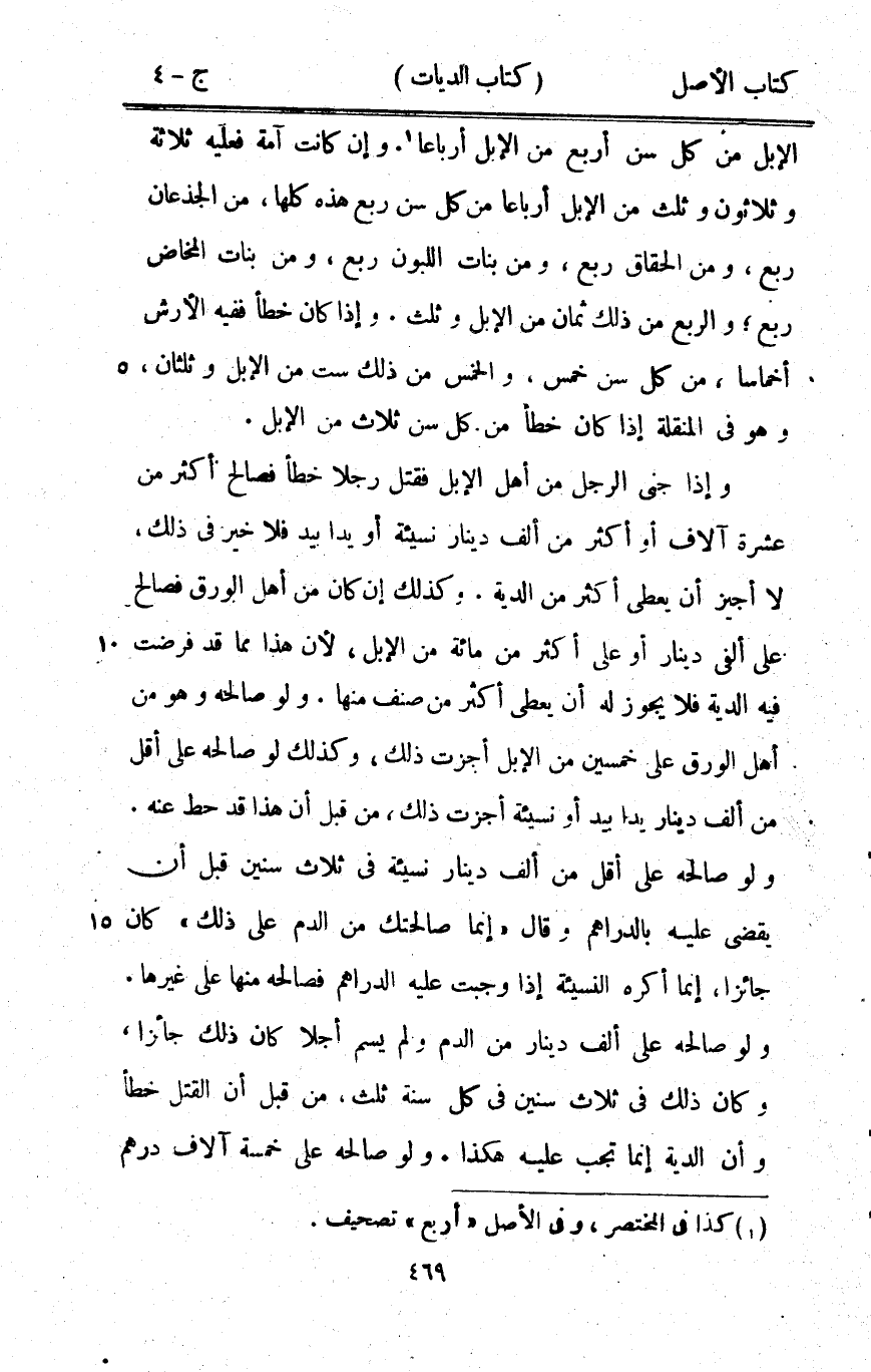 الْإِبِل من كل سنّ أَربع من الْإِبِل أَربَاعًا وَإِن كَانَت آمة فَعَلَيهِ ثَلَاثَة وَثَلَاثُونَ وَثلث من الْإِبِل أَربَاعًا من كل سنّ ربع هَذِه كلهَا من الجذعان ربع وَمن الحقاق ربع وَمن بَنَات اللَّبُون ربع وَمن بَنَات الْمَخَاض ربع وَالرّبع من ذَلِك ثَمَان من الْإِبِل وَثلث وَإِذا كَانَ خطأ فَفِيهِ الْأَرْش أَخْمَاسًا من كل سنّ خمس وَالْخمس من ذَلِك سِتّ من الْإِبِل وَثُلُثَانِ وَهُوَ فِي المنقلة إِذا كَانَ خطأ من كل سنّ ثَلَاث من الْإِبِل وَإِذا جنى الرجل من أهل الْإِبِل فَقتل رجلا خطأ فَصَالح أَكثر من عشرَة آلَاف أَو أَكثر من ألف دِينَار نَسِيئَة أَو يدا بيد فَلَا خير فِي ذَلِك لَا أُجِيز أَن يُعْطي أَكثر من الدِّيَة وَكَذَلِكَ إِن كَانَ من أهل الْوَرق فَصَالح على ألفي دِينَار أَو على أَكثر من مائَة من الْإِبِل لِأَن هَذَا مِمَّا قد فرضت فِيهِ الدِّيَة فَلَا يجوز لَهُ أَن يُعْطي أَكثر من صنف مِنْهَا وَلَو صَالحه وَهُوَ من أهل الْوَرق على خمسين من الْإِبِل أجزت ذَلِك وَكَذَلِكَ لَو صَالحه على أقل من ألف دِينَار يدا بيد أَو نَسِيئَة أجزت ذَلِك من قبل أَن هَذَا قد حط عَنهُ وَلَو صَالحه على أقل من ألف دِينَار نَسِيئَة فِي ثَلَاث سِنِين قبل أَن يقْضى عَلَيْهِ بِالدَّرَاهِمِ وَقَالَ إِنَّمَا صالحتك من الدَّم على ذَلِك كَانَ جَائِزا إِنَّمَا أكره النَّسِيئَة إِذا وَجَبت عَلَيْهِ الدَّرَاهِم فَصَالحه مِنْهَا على غَيرهَا وَلَو صَالحه على ألف دِينَار من الدَّم وَلم يسم أَََجَلًا كَانَ ذَلِك جَائِز وَكَانَ ذَلِك فِي ثَلَاث سِنِين فِي كل سنة ثلث من قبل أَن الْقَتْل خطأ وَأَن الدِّيَة إِنَّمَا تجب عَلَيْهِ هَكَذَا وَلَو صَالحه على خَمْسَة آلَاف دِرْهَم