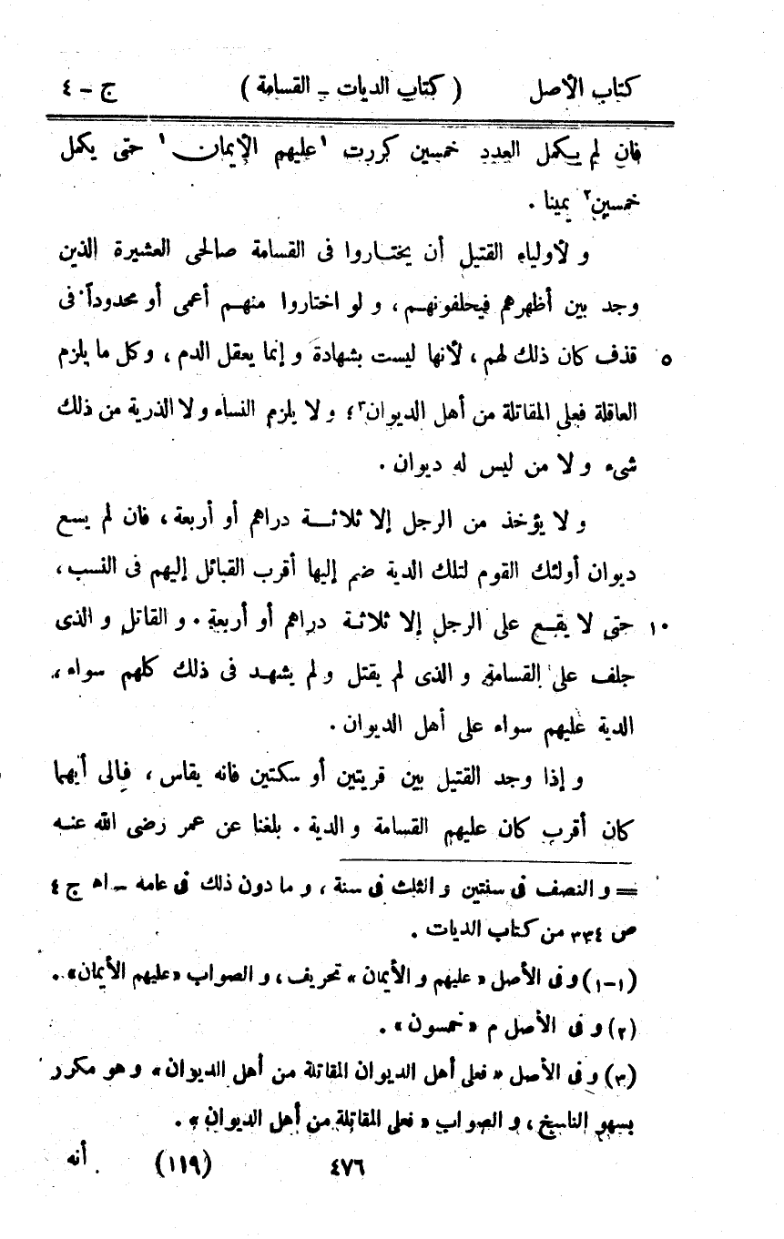 ولأولياء الْقَتِيل أَن يختاروا فِي الْقسَامَة صالحي الْعَشِيرَة الَّذين وجد بَين أظهرهم فيحلفونهم وَلَو اخْتَارُوا مِنْهُم أعمى أَو محدودا فِي قذف كَانَ ذَلِك لَهُم لِأَنَّهَا لَيست بِشَهَادَة وَإِنَّمَا يعقل الدَّم وكل مَا يلْزم الْعَاقِلَة فعلى الْمُقَاتلَة من أهل الدِّيوَان وَلَا يلْزم النِّسَاء وَلَا الذُّرِّيَّة من ذَلِك شَيْء وَلَا من لَيْسَ لَهُ ديوَان وَلَا يُؤْخَذ من الرجل إِلَّا ثَلَاثَة دَرَاهِم أَو أَرْبَعَة فان لم يسع ديوَان أُولَئِكَ الْقَوْم لتِلْك الدِّيَة ضم إِلَيْهَا أقرب الْقَبَائِل إِلَيْهِم فِي النّسَب حَتَّى لَا يَقع على الرجل إِلَّا ثَلَاثَة دَرَاهِم أَو أَرْبَعَة وَالْقَاتِل وَالَّذِي حلف على الْقسَامَة وَالَّذِي لم يقتل وَلم يشْهد فِي ذَلِك كلهم سَوَاء الدِّيَة عَلَيْهِم سَوَاء على أهل الدِّيوَان