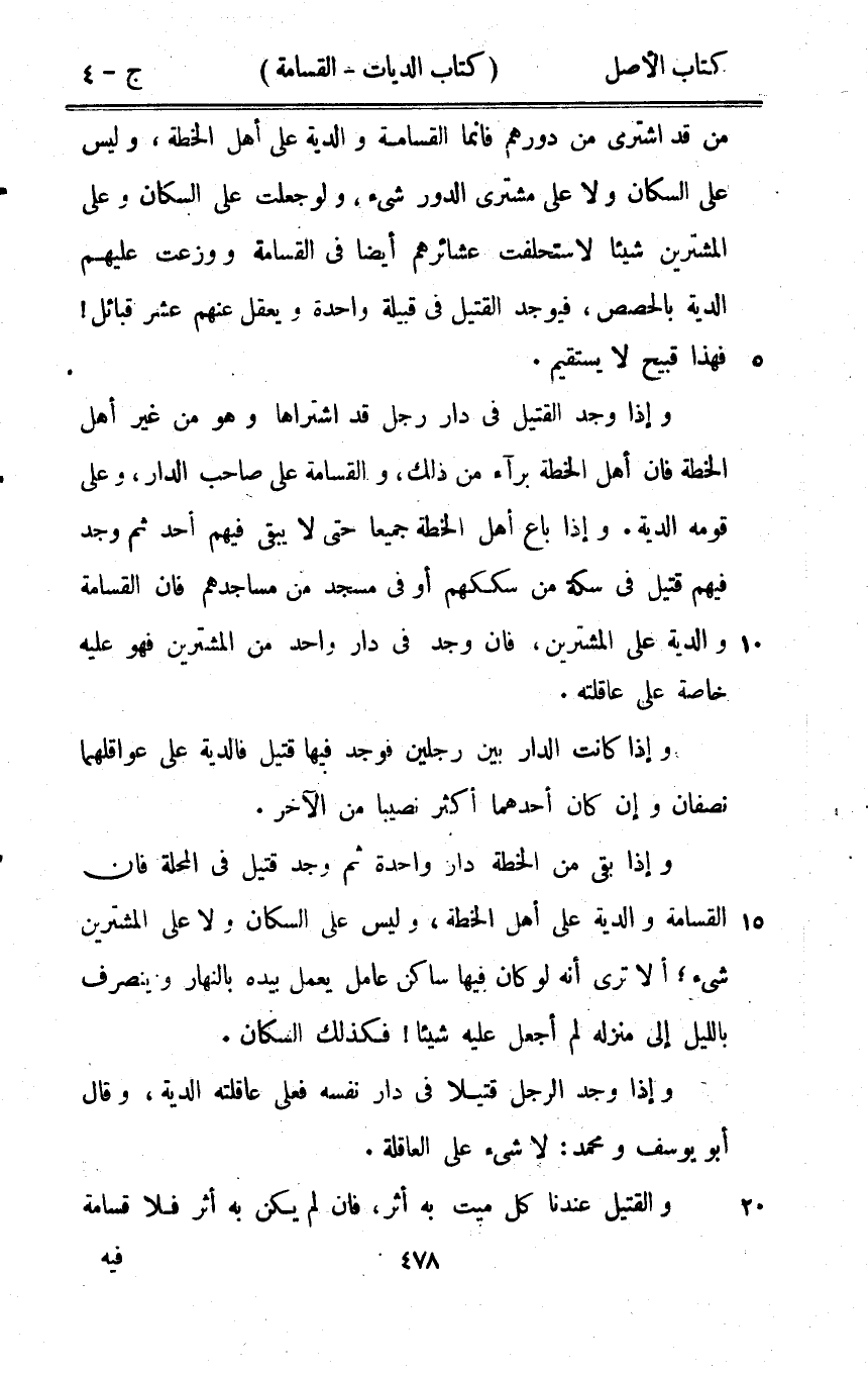 وَإِذا كَانَت الدَّار بَين رجلَيْنِ فَوجدَ فِيهَا قَتِيل فَالدِّيَة على عواقلهما نِصْفَانِ وَإِن كَانَ أَحدهمَا أَكثر نَصِيبا من الآخر وَإِذا بَقِي من الخطة دَار وَاحِدَة ثمَّ وجد قَتِيل فِي الْمحلة فان الْقسَامَة وَالدية على أهل الخطة وَلَيْسَ على السكان وَلَا على المشترين شَيْء أَلا ترى أَنه لَو كَانَ فِيهَا سَاكن عَامل يعْمل بِيَدِهِ بِالنَّهَارِ وينصرف بِاللَّيْلِ إِلَى منزله لم أجعَل عَلَيْهِ شَيْئا فَكَذَلِك السكان وَإِذا وجد الرجل قَتِيلا فِي دَار نَفسه فعلى عَاقِلَته الدِّيَة وَقَالَ أَبُو يُوسُف وَمُحَمّد لَا شَيْء على الْعَاقِلَة والقتيل عندنَا كل ميت بِهِ أثر فان لم يكن بِهِ أثر فَلَا قسَامَة