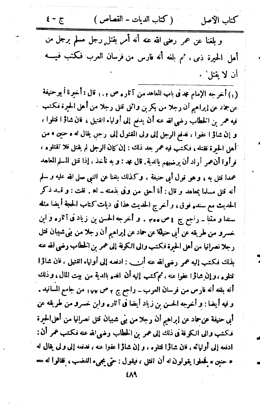 وبلغنا عَن عمر رَضِي الله عَنهُ أَنه أَمر بقتل رجل مُسلم بِرَجُل من أهل الْحيرَة ذمِّي ثمَّ بلغه أَنه فَارس من فرسَان الْعَرَب فَكتب فِيهِ أَن لَا يقتل