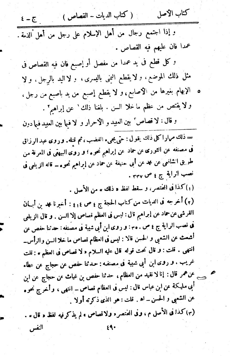 وَإِذا اجْتمع رجال من أهل الْإِسْلَام على رجل من أهل الذِّمَّة عمدا فان عَلَيْهِم فِيهِ الْقصاص وكل قطع فِي يَد عمدا من مفصل أَو إِصْبَع فان فِيهِ الْقصاص فِي مثل ذَلِك الْموضع وَلَا يقطع الْيُمْنَى باليسرى وَلَا الْيَد بِالرجلِ وَلَا الْإِبْهَام بغَيْرهَا من الْأَصَابِع وَلَا يقطع إِصْبَع من يَد باصبع من رجل وَلَا يقْتَصّ من عظم مَا خلا السن بلغنَا ذَلِك عَن إِبْرَاهِيم وَقَالَ لَا قصاص بَين العبيد والأحرار وَلَا فِيمَا بَين العبيد فِيمَا دون