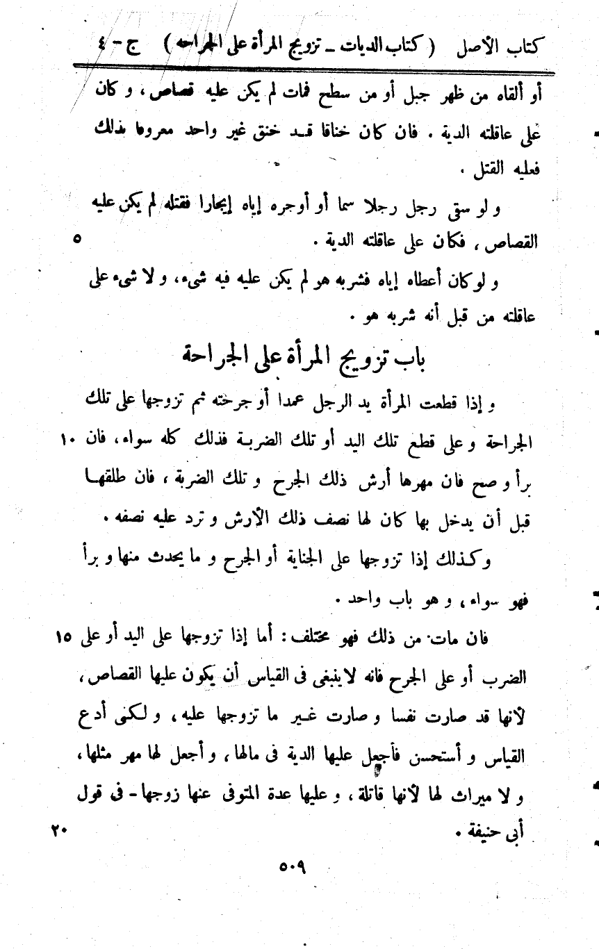 - وَإِذا قطعت الْمَرْأَة يَد الرجل عمدا أَو جرحته ثمَّ تزَوجهَا على تِلْكَ الْجراحَة وعَلى قطع تِلْكَ الْيَد أَو تِلْكَ الضَّرْبَة فَذَلِك كُله سَوَاء فان برأَ وَصَحَّ فان مهرهَا أرش ذَلِك الْجرْح وَتلك الضَّرْبَة فان طَلقهَا قبل أَن يدْخل بهَا كَانَ لَهَا نصف ذَلِك الْأَرْش وَترد عَلَيْهِ نصفه وَكَذَلِكَ إِذا تزَوجهَا على الْجِنَايَة أَو الْجرْح وَمَا يحدث مِنْهَا وبرأ فَهُوَ سَوَاء وَهُوَ بَاب وَاحِد فان مَاتَ من ذَلِك فَهُوَ مُخْتَلف أما إِذا تزَوجهَا على الْيَد أَو على الضَّرْب أَو على الْجرْح فانه لَا يَنْبَغِي فِي الْقيَاس أَن يكون عَلَيْهَا الْقصاص لِأَنَّهَا قد صَارَت نفسا وَصَارَت غير مَا تزَوجهَا عَلَيْهِ وَلَكِنِّي أدع الْقيَاس وأستحسن فأجعل عَلَيْهَا الدِّيَة فِي مَالهَا وَأَجْعَل لَهَا مهر مثلهَا وَلَا مِيرَاث لَهَا لِأَنَّهَا قاتلة وَعَلَيْهَا عدَّة المتوفي عَنْهَا زَوجهَا فِي قَول أبي حنيفَة