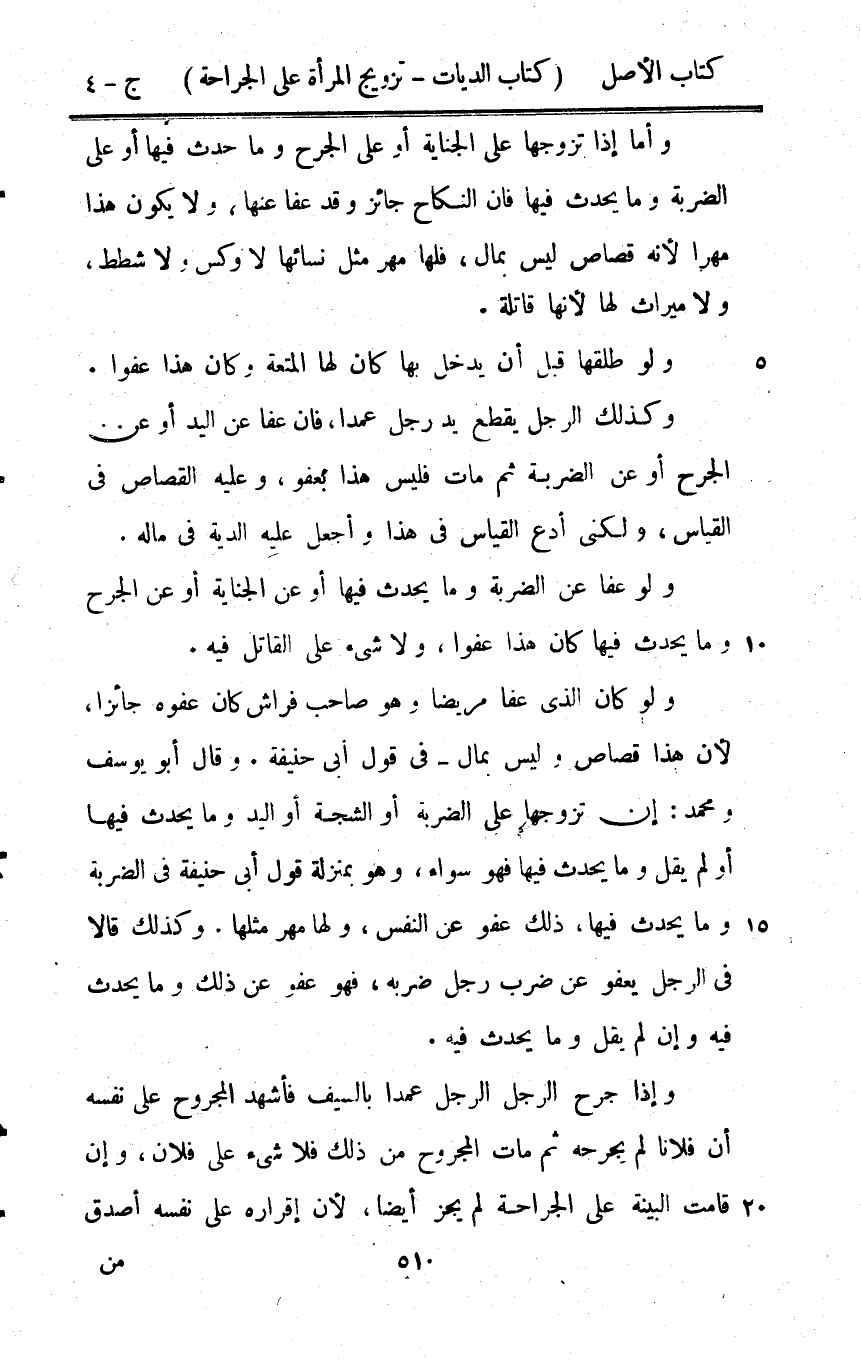 وَأما إِذا تزَوجهَا على الْجِنَايَة أَو على الْجرْح وَمَا حدث فِيهَا أَو على الضَّرْبَة وَمَا يحدث فِيهَا فان النِّكَاح جَائِز وَقد عَفا عَنْهَا وَلَا يكون هَذَا مهْرا لِأَنَّهُ قصاص لَيْسَ بِمَال فلهَا مهر مثل نسائها لَا وكس وَلَا شطط وَلَا مِيرَاث لَهَا لِأَنَّهَا قاتلة وَلَو طَلقهَا قبل أَن يدْخل بهَا كَانَ لَهَا الْمُتْعَة وَكَانَ هَذَا عفوا وَكَذَلِكَ الرجل يقطع يَد رجل عمدا فان عَفا عَن الْيَد أَو عَن الْجرْح أَو عَن الضَّرْبَة ثمَّ مَاتَ فَلَيْسَ هَذَا بِعَفْو وَعَلِيهِ الْقصاص فِي الْقيَاس وَلَكِنِّي أدع الْقيَاس فِي هَذَا وَأَجْعَل عَلَيْهِ الدِّيَة فِي مَاله وَلَو عَفا عَن الضَّرْبَة وَمَا يحدث فِيهَا أَو عَن الْجِنَايَة أَو عَن الْجرْح وَمَا يحدث فِيهَا كَانَ هَذَا عفوا وَلَا شَيْء على الْقَاتِل فِيهِ وَلَو كَانَ الَّذِي عَفا مَرِيضا وَهُوَ صَاحب فرَاش كَانَ عَفوه جَائِزا لِأَن هَذَا قصاص وَلَيْسَ بِمَال فِي قَول أبي حنيفَة وَقَالَ أَبُو يُوسُف وَمُحَمّد إِن تزَوجهَا على الضَّرْبَة أَو الشَّجَّة أَو الْيَد وَمَا يحدث فِيهَا أَو لم يقل وَمَا يحدث فِيهَا فَهُوَ سَوَاء وَهُوَ بِمَنْزِلَة قَول ابي حنيفَة فِي الضَّرْبَة وَمَا يحدث فِيهَا ذَلِك عَفْو عَن النَّفس وَلها مهر مثلهَا وَكَذَلِكَ قَالَا فِي الرجل يعْفُو عَن ضرب رجل ضربه فَهُوَ عَفْو عَن ذَلِك وَمَا يحدث فِيهِ وَإِن لم يقل وَمَا يحدث فِيهِ وَإِذا جرح الرجل الرجل عمدا بِالسَّيْفِ فَأشْهد الْمَجْرُوح على نَفسه أَن فلَانا لم يجرحه ثمَّ مَاتَ الْمَجْرُوح من ذَلِك فَلَا شَيْء على فلَان وَإِن قَامَت الْبَيِّنَة على الْجراحَة لم يجز أَيْضا لِأَن إِقْرَاره على نَفسه أصدق