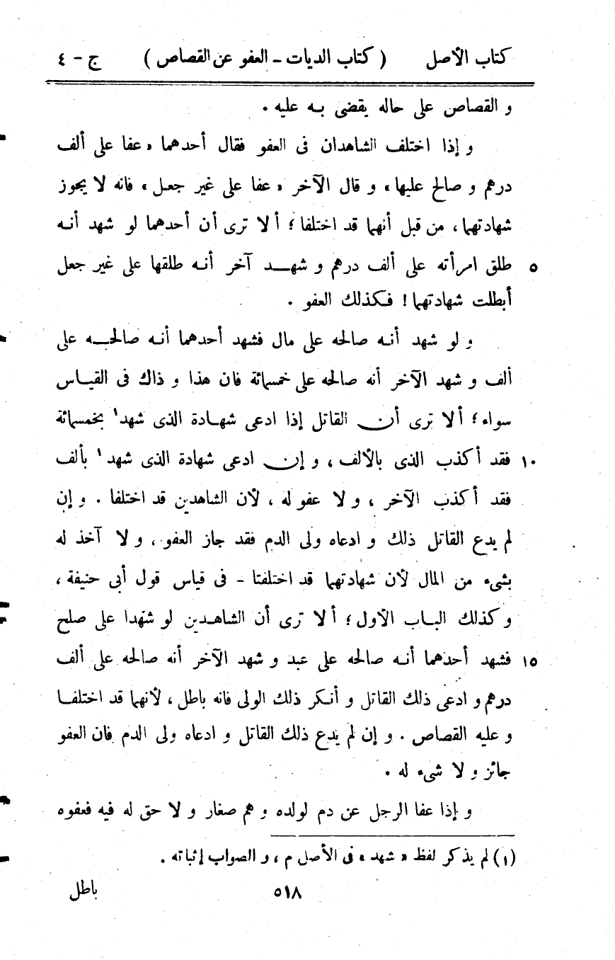 وَالْقصاص على حَاله يقْضِي بِهِ عَلَيْهِ وَإِذا اخْتلف الشَّاهِدَانِ فِي الْعَفو فَقَالَ أَحدهمَا عَفا على ألف دِرْهَم وَصَالح عَلَيْهَا وَقَالَ الآخر عَفا على غير جعل فانه لَا يجوز شَهَادَتهمَا من قبل أَنَّهُمَا قد اخْتلفَا أَلا ترى أَن أَحدهمَا لَو شهد أَنه طلق امْرَأَته على ألف دِرْهَم وَشهد آخر أَنه طَلقهَا على غير جعل أبطلت شَهَادَتهمَا فَكَذَلِك الْعَفو وَلَو شهد أَنه صَالحه على مَال فَشهد أَحدهمَا أَنه صَالحه على ألف وَشهد الآخر أَنه صَالحه على خَمْسمِائَة فان هَذَا وَذَاكَ فِي الْقيَاس سَوَاء أَلا ترى أَن الْقَاتِل إِذا ادّعى شَهَادَة الَّذِي شهد بِخَمْسِمِائَة فقد أكذب الَّذِي بِالْألف وَإِن ادّعى شَهَادَة الَّذِي شهد بِأَلف فقد أكذب الآخر وَلَا عَفْو لَهُ لِأَن الشَّاهِدين قد اخْتلفَا وَإِن لم يدع الْقَاتِل ذَلِك وادعاه ولي الدَّم فقد جَازَ الْعَفو وَلَا آخذ لَهُ بِشَيْء من المَال لِأَن شَهَادَتهمَا قد اخْتلفَا فِي قِيَاس قَول ابي حنيفَة وَكَذَلِكَ الْبَاب الأول أَلا ترى أَن الشَّاهِدين لَو شَهدا على صلح فَشهد أَحدهمَا أَنه صَالحه على عبد وَشهد الآخر أَنه صَالحه على ألف دِرْهَم وَادّعى ذَلِك الْقَاتِل وَأنكر ذَلِك الْوَلِيّ فانه بَاطِل لِأَنَّهُمَا قد اخْتلفَا وَعَلِيهِ الْقصاص وَإِن لم يدع ذَلِك الْقَاتِل وادعاه ولي الدَّم فان الْعَفو جَائِز وَلَا شَيْء لَهُ وَإِذا عَفا الرجل عَن دم لوَلَده وهم صغَار وَلَا حق لَهُ فِيهِ فعفوه