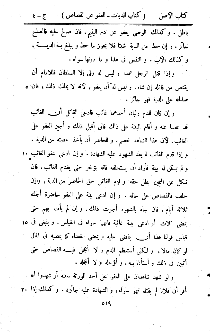 بَاطِل وَكَذَلِكَ الْوَصِيّ يعْفُو عَن دم الْيَتِيم فان صَالح عَلَيْهِ فَالصُّلْح جَائِز وَإِن حط من الدِّيَة شَيْئا فَلَا يجوز مَا حط ويبلغ بِهِ الدِّيَة وَكَذَلِكَ الْأَب وَالنَّفس فِي هَذَا وَمَا دونهَا سَوَاء وَإِذا قتل الرجل عمدا وَلَيْسَ لَهُ ولي إِلَّا السُّلْطَان فللامام أَن يقْتَصّ من قَاتله إِن شَاءَ وَلَيْسَ لَهُ أَن يعْفُو لِأَنَّهُ لَا يملك ذَلِك فان صَالحه على الدِّيَة فَهُوَ جَائِز وَإِن كَانَ للدم وليان أَحدهمَا غَائِب فَادّعى الْقَاتِل أَن الْغَائِب قد عَفا عَنهُ وَأقَام الْبَيِّنَة على ذَلِك فَانِي أقبل ذَلِك وأجيز الْعَفو على الْغَائِب لِأَن هَذَا الشَّاهِد خصم وللحاضر أَن يَأْخُذ حِصَّته من الدِّيَة وَإِذا قدم الْغَائِب لم يعد الشُّهُود عَلَيْهِ الشَّهَادَة وَإِن ادّعى عَفْو الْغَائِب وَلم يكن لَهُ بَيِّنَة فَأَرَادَ أَن يستحلفه فانه يُؤَخر حَتَّى يقدم الْغَائِب فان نكل عَن الْيَمين بَطل حَقه وَلزِمَ الْقَاتِل حق الْحَاضِر من الدِّيَة وَإِن حلف فالقصاص على حَاله وَإِن ادّعى بَيِّنَة على الْعَفو حَاضِرَة أجلته ثَلَاثَة أَيَّام فان جَاءَ بالشهود أجزت ذَلِك وَإِن لم يَأْتِ بهم حَتَّى يمْضِي ثَلَاث أَو ادّعى بَيِّنَة غَائِبَة فانهما سَوَاء فِي الْقيَاس وَيَنْبَغِي فِي قِيَاس قَوْلنَا هَذَا أَن يقْضِي عَلَيْهِ ويمضي الْقَضَاء كَمَا يمضيه فِي المَال لَو كَانَ مَالا وَلَكِنِّي أستعظم الدَّم وَلَا أعجل فِيهِ الْقصاص حَتَّى أتبين فِي ذَلِك وأستأن بِهِ وأؤجله وَلَا أعجله