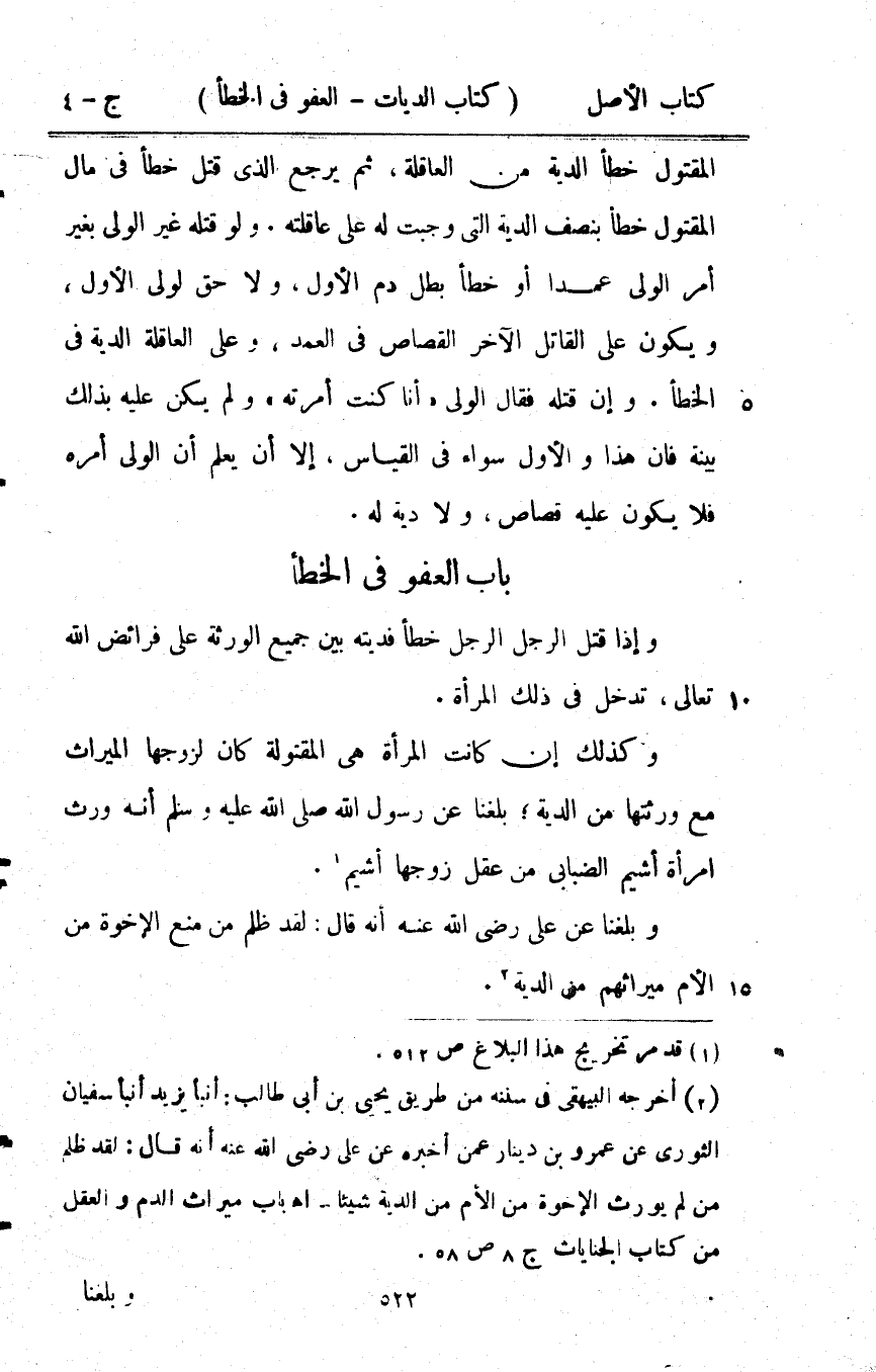 - وَإِذا قتل الرجل الرجل خطأ فديته بَين جَمِيع الْوَرَثَة على فَرَائض الله تَعَالَى تدخل فِي ذَلِك الْمَرْأَة وَكَذَلِكَ إِن كَانَت الْمَرْأَة هِيَ المقتولة كَانَ لزَوجهَا الْمِيرَاث مَعَ ورثتها من الدِّيَة بلغنَا عَن رَسُول الله صلى الله عَلَيْهِ وَسلم أَنه ورث امْرَأَة اشيم الضبابِي من عقل زَوجهَا أَشْيَم