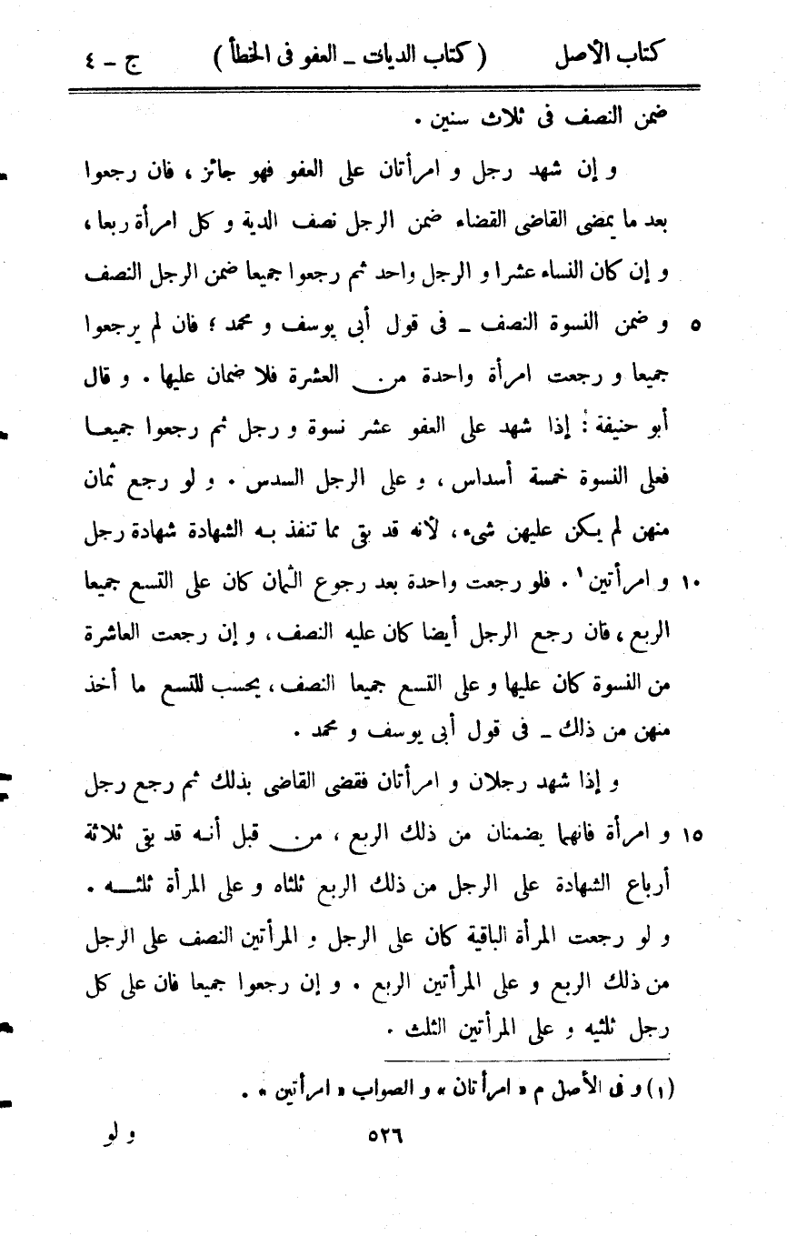 ضمن النّصْف فِي ثَلَاث سِنِين وَإِن شهد رجل وَامْرَأَتَانِ على الْعَفو فَهُوَ جَائِز فان رجعُوا بعد مَا يمْضِي القَاضِي الْقَضَاء ضمن الرجل نصف الدِّيَة وكل امْرَأَة ربعا وَإِن كَانَ النِّسَاء عشرا وَالرجل وَاحِد ثمَّ رجعُوا جَمِيعًا ضمن الرجل النّصْف وَضمن النسْوَة النّصْف فِي قَول أبي يُوسُف وَمُحَمّد فان لم يرجِعوا جَمِيعًا وَرجعت امْرَأَة وَاحِدَة من الْعشْرَة فَلَا ضَمَان عَلَيْهَا وَقَالَ أَبُو حنيفَة إِذا شهد على الْعَفو عشر نسْوَة وَرجل ثمَّ رجعُوا جَمِيعًا فعلى النسْوَة خَمْسَة أَسْدَاس وعَلى الرجل السُّدس وَلَو رَجَعَ ثَمَان مِنْهُنَّ لم يكن عَلَيْهِنَّ شَيْء لِأَنَّهُ قد بَقِي مِمَّا تنفذ بِهِ الشَّهَادَة شَهَادَة رجل وَامْرَأَتَيْنِ فَلَو رجعت وَاحِدَة بعد رُجُوع الثمان كَانَ على التسع جَمِيعًا الرّبع فان رَجَعَ الرجل أَيْضا كَانَ عَلَيْهِ النّصْف وَإِن رجعت الْعَاشِرَة من النسْوَة كَانَ عَلَيْهَا وعَلى التسع جَمِيعًا النّصْف يحْسب للتسع مَا أَخذ مِنْهُنَّ من ذَلِك فِي قَول أبي يُوسُف وَمُحَمّد