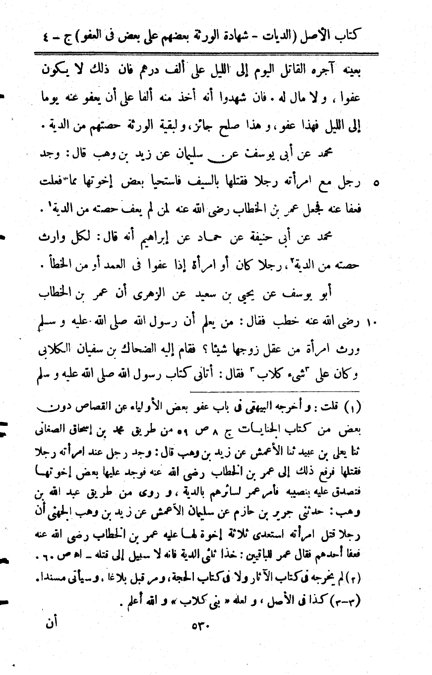 مُحَمَّد عَن أبي يُوسُف عَن سُلَيْمَان عَن زيد بن وهب قَالَ وجد رجل مَعَ امْرَأَته رجلا فَقَتلهَا بِالسَّيْفِ فاستحيا بعض إخوتها مِمَّا فعلت فَعَفَا عَنهُ فَجعل عمر بن الْخطاب رَضِي الله عَنهُ لمن لم يعف حِصَّته من الدِّيَة مُحَمَّد عَن أبي حنيفَة عَن حَمَّاد عَن إِبْرَاهِيم أَنه قَالَ لكل وَارِث حِصَّته من الدِّيَة رجلا كَانَ أَو امْرَأَة إِذا عفوا فِي الْعمد أَو من الْخَطَأ