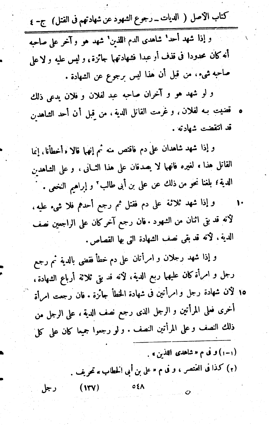 وَإِذا شهد أحد شَاهِدي الدَّم اللَّذين شهد هُوَ وَآخر على صَاحبه أَنه كَانَ محدودا فِي قذف أَو عبدا فشهادتهما جَائِزَة وَلَيْسَ عَلَيْهِ وَلَا على صَاحبه شَيْء من قبل أَن هَذَا لَيْسَ بِرُجُوع عَن الشَّهَادَة وَلَو شهد هُوَ وآخران صَاحبه عبد لفُلَان وَفُلَان يَدعِي ذَلِك قضيت بِهِ لفُلَان وغرمت الْقَاتِل الدِّيَة من قبل أَن أحد الشَّاهِدين قد انتقضت شَهَادَته وَإِذا شهد شَاهِدَانِ على دم فاقتص مِنْهُ ثمَّ إنَّهُمَا قَالَا أَخْطَأنَا إِنَّمَا الْقَاتِل هَذَا لغيره فانهما لَا يصدقان على هَذَا الثَّانِي وعَلى الشَّاهِدين الدِّيَة بلغنَا نَحْو من ذَلِك عَن عَليّ بن أبي طَالب وَإِبْرَاهِيم النَّخعِيّ وَإِذا شهد ثَلَاثَة على دم فَقتل ثمَّ رَجَعَ أحدهم فَلَا شَيْء عَلَيْهِ لِأَنَّهُ قد بَقِي اثْنَان من الشُّهُود فان رَجَعَ آخر كَانَ على الراجعين نصف الدِّيَة لِأَنَّهُ قد بَقِي نصف الشَّهَادَة الَّتِي بهَا الْقصاص وَإِذا شهد رجلَانِ وَامْرَأَتَانِ على دم خطأ فقضي بِالدِّيَةِ ثمَّ رَجَعَ رجل وَامْرَأَة كَانَ عَلَيْهِمَا ربع الدِّيَة لِأَنَّهُ قد بَقِي ثَلَاثَة أَربَاع الشَّهَادَة لِأَن شَهَادَة رجل وَامْرَأَتَيْنِ فِي شَهَادَة الْخَطَأ جَائِزَة فان رجعت امْرَأَة أُخْرَى فعلى الْمَرْأَتَيْنِ وَالرجل الَّذِي رَجَعَ نصف الدِّيَة على الرجل من ذَلِك النّصْف وعَلى الْمَرْأَتَيْنِ النّصْف وَلَو رجعُوا جَمِيعًا كَانَ على كل