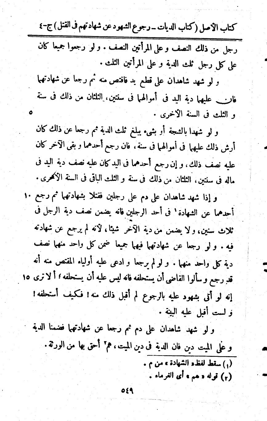 رجل من ذَلِك النّصْف وعَلى الْمَرْأَتَيْنِ النّصْف وَلَو رجعُوا جَمِيعًا كَانَ على كل رجل ثلث الدِّيَة وعَلى الْمَرْأَتَيْنِ الثُّلُث وَلَو شهد شَاهِدَانِ على قطع يَد فاقتص مِنْهُ ثمَّ رجعا عَن شَهَادَتهمَا فان عَلَيْهِمَا دِيَة الْيَد فِي أموالهما فِي سنتَيْن الثُّلُثَانِ من ذَلِك فِي سنة وَالثلث فِي السّنة الْأُخْرَى وَلَو شَهدا بالشجة أَو بِشَيْء يبلغ ثلث الدِّيَة ثمَّ رجعا عَن ذَلِك كَانَ أرش ذَلِك عَلَيْهِمَا فِي أموالهما فِي سنة فان رَجَعَ أَحدهمَا وَبَقِي الآخر كَانَ عَلَيْهِ نصف ذَلِك وَإِن رَجَعَ أَحدهمَا فِي الْيَد كَانَ عَلَيْهِ نصف دِيَة الْيَد فِي مَاله فِي سنتَيْن الثُّلُثَانِ من ذَلِك فِي سنة وَالثلث الْبَاقِي فِي السّنة الْأُخْرَى وَإِذا شهد شَاهِدَانِ على دم على رجلَيْنِ فقتلا بِشَهَادَتِهِمَا ثمَّ رَجَعَ أَحدهمَا عَن الشَّهَادَة فِي أحد الرجلَيْن فانه يضمن نصف دِيَة الرجل فِي ثَلَاث سِنِين وَلَا يضمن من دِيَة الآخر شَيْئا لِأَنَّهُ لم يرجع عَن شَهَادَته فِيهِ وَلَو رجعا عَن شَهَادَتهمَا فيهمَا جَمِيعًا ضمن كل وَاحِد مِنْهُمَا نصف دِيَة كل وَاحِد مِنْهُمَا وَلَو لم يرجعا وَادّعى عَلَيْهِ أَوْلِيَاء الْمُقْتَص مِنْهُ أَنه قد رَجَعَ وسألوا القَاضِي أَن يستحلفه فانه لَيْسَ عَلَيْهِ أَن يستحلفه أَلا ترى إِنَّه لَو أَتَى بِشُهُود عَلَيْهِ بِالرُّجُوعِ لم أقبل ذَلِك مِنْهُ فَكيف أستحلفه وَلست أقبل عَلَيْهِ الْبَيِّنَة