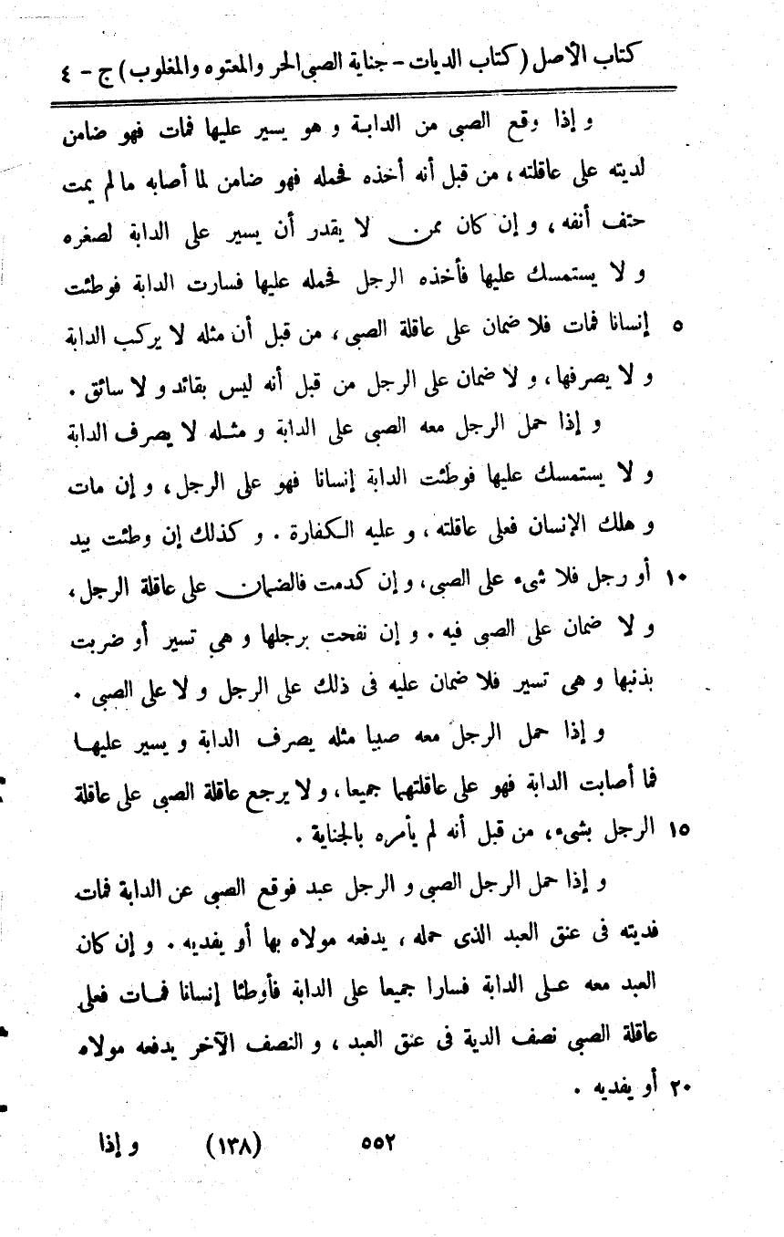وَإِذا وَقع الصَّبِي من الدَّابَّة وَهُوَ يسيرعليها فَمَاتَ فَهُوَ ضَامِن لديته على عَاقِلَته من قبل أَنه أَخذه فَحَمله فَهُوَ ضَامِن لما أَصَابَهُ مالم يمت حتف أَنفه وَإِن كَانَ مِمَّن لَا يقدر أَن يسير على الدَّابَّة لصغره وَلَا يسْتَمْسك عَلَيْهَا فَأَخذه الرجل فَحَمله عَلَيْهَا فسارت الدَّابَّة فوطئت إنْسَانا فَمَاتَ فَلَا ضَمَان على عَاقِلَة الصَّبِي من قبل أَن مثله لَا يركب الدَّابَّة وَلَا يصرفهَا وَلَا ضَمَان على الرجل من قبل أَنه لَيْسَ بقائد وَلَا سائق وَإِذا حمل الرجل مَعَه الصَّبِي على الدَّابَّة وَمثله لَا يصرف الدَّابَّة وَلَا يسْتَمْسك عَلَيْهَا فوطئت الدَّابَّة إنْسَانا فَهُوَ على الرجل وَإِن مَاتَ وَهلك الْإِنْسَان فعلى عَاقِلَته وَعَلِيهِ الْكَفَّارَة وَكَذَلِكَ إِن وطِئت بيد أَو رجل فَلَا شَيْء على الصَّبِي وَإِن كدمت فَالضَّمَان على عَاقِلَة الرجل وَلَا ضَمَان على الصَّبِي فِيهِ وَإِن نفحت برجلها وَهِي تسير أَو ضربت بذنبها وَهِي تسير فَلَا ضَمَان عَلَيْهِ فِي ذَلِك على الرجل وَلَا على الصَّبِي وَإِذا حمل الرجل مَعَه صَبيا مثله يصرف الدَّابَّة ويسير عَلَيْهَا فَمَا أَصَابَت الدَّابَّة فَهُوَ على عاقلتهما جَمِيعًا وَلَا يرجع عَاقِلَة الصَّبِي على عَاقِلَة الرجل بِشَيْء من أَنه لم يَأْمُرهُ بِالْجِنَايَةِ وَإِذا حمل الرجل الصَّبِي وَالرجل عبد فَوَقع الصَّبِي عَن الدَّابَّة فَمَاتَ فديته فِي عنق العَبْد الَّذِي حمله يَدْفَعهُ مَوْلَاهُ بهَا أَو يفْدِيه وَإِن كَانَ العَبْد مَعَه على الدَّابَّة فسارا جَمِيعًا على الدَّابَّة فأوطئا إنْسَانا فَمَاتَ فعلى عَاقِلَة الصَّبِي نصف الدِّيَة فِي عنق العَبْد وَالنّصف الآخر يَدْفَعهُ مَوْلَاهُ