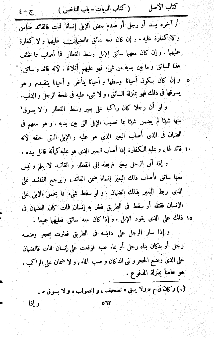 أَو آخِره بيد أَو رجل أَو صدم بعض الْإِبِل إنْسَانا فَمَاتَ فالقائد ضَامِن وَلَا كَفَّارَة عَلَيْهِ وَإِن كَانَ مَعَه سائق فَالضَّمَان عَلَيْهِمَا وَلَا كَفَّارَة عَلَيْهِمَا وَإِن كَانَ مَعَهُمَا سائق الْإِبِل وسط القطار فَمَا أصَاب مِمَّا خلف هَذَا السَّائِق وَمَا بَين يَدَيْهِ من شَيْء فَهُوَ عَلَيْهِم أَثلَاثًا لنه قَائِد وسائق وَإِن كَانَ يكون أَحْيَانًا وَسطهَا وَأَحْيَانا يتَأَخَّر وَأَحْيَانا يتَقَدَّم وَهُوَ يَسُوقهَا فِي ذَلِك فَهُوَ بِمَنْزِلَة السَّائِق وَلَا شَيْء عَلَيْهِ فِي نفحة الرجل والذنب وَلَو أَن رجلا كَانَ رَاكِبًا على بعير وسط القطار وَلَا يَسُوق مِنْهَا شَيْئا لم يضمن شَيْئا مِمَّا تصيب الْإِبِل الَّتِي بَين يَدَيْهِ وَهُوَ مَعَهم فِي الضَّمَان فِي الَّذِي أصَاب الْبَعِير الَّذِي هُوَ عَلَيْهِ وَالْإِبِل الَّتِي خَلفه لِأَنَّهُ قَائِد لَهَا وَعَلِيهِ الْكَفَّارَة إِذا أصَاب الْبَعِير الَّذِي هُوَ عَلَيْهِ كَأَنَّهُ قَاتل بِيَدِهِ وَإِذا أَتَى الرجل بِبَعِير فربطه إِلَى القطار والقائد لَا يعلم وَلَيْسَ مَعهَا سائق فَأصَاب ذَلِك الْبَعِير إنْسَانا ضمن الْقَائِد وَيرجع الْقَائِد على الَّذِي ربط الْبَعِير بذلك الضَّمَان وَلَو سقط شَيْء مِمَّا يحمل الْإِبِل على الْإِنْسَان فَقتله أَو سقط فِي الطَّرِيق فعثر بِهِ إِنْسَان فَمَاتَ كَانَ الضَّمَان فِي ذَلِك على الَّذِي يَقُود الْإِبِل وَإِذا كَانَ مَعَه سائق فعلَيْهِمَا جَمِيعًا وَإِذا سَار الرجل على دَابَّته فِي الطَّرِيق فَعَثَرَتْ بِحجر وَضعه رجل أَو بدكان بناه رجل أَو بِمَاء صبه فَوَقَعت على إِنْسَان فَمَاتَ فَالضَّمَان على الَّذِي وضع الْحجر وَبني الدّكان وصب المَاء وَلَا ضَمَان على الرَّاكِب هُوَ هَاهُنَا بِمَنْزِلَة الْمَدْفُوع