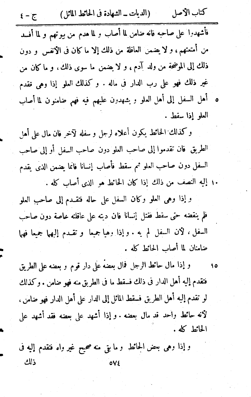 إِذا سقط وَكَذَلِكَ الْحَائِط يكون أَعْلَاهُ لرجل وسفله لآخر فان مَال على أهل الطَّرِيق فان تقدمُوا إِلَى صَاحب الْعُلُوّ دون صَاحب السّفل أَو إِلَى صَاحب السّفل دون صَاحب الْعُلُوّ ثمَّ سقط فاصاب إنْسَانا فانما يضمن الَّذِي يقدم إِلَيْهِ النّصْف من ذَلِك إِذا كَانَ الْحَائِط هُوَ الَّذِي اصاب كُله وَإِذا وَهِي الْعُلُوّ وَكَانَ السّفل على حَاله فَتقدم إِلَى صَاحب الْعُلُوّ فَلم ينْقضه حَتَّى سقط فَقتل إنْسَانا فان دِيَته على عَاقِلَته خَاصَّة دون صَاحب السّفل لِأَن السّفل لم يه وَإِذا وهيا جَمِيعًا وَتقدم إِلَيْهِمَا جَمِيعًا فَمَا ضامنان لما أصَاب الْحَائِط كُله