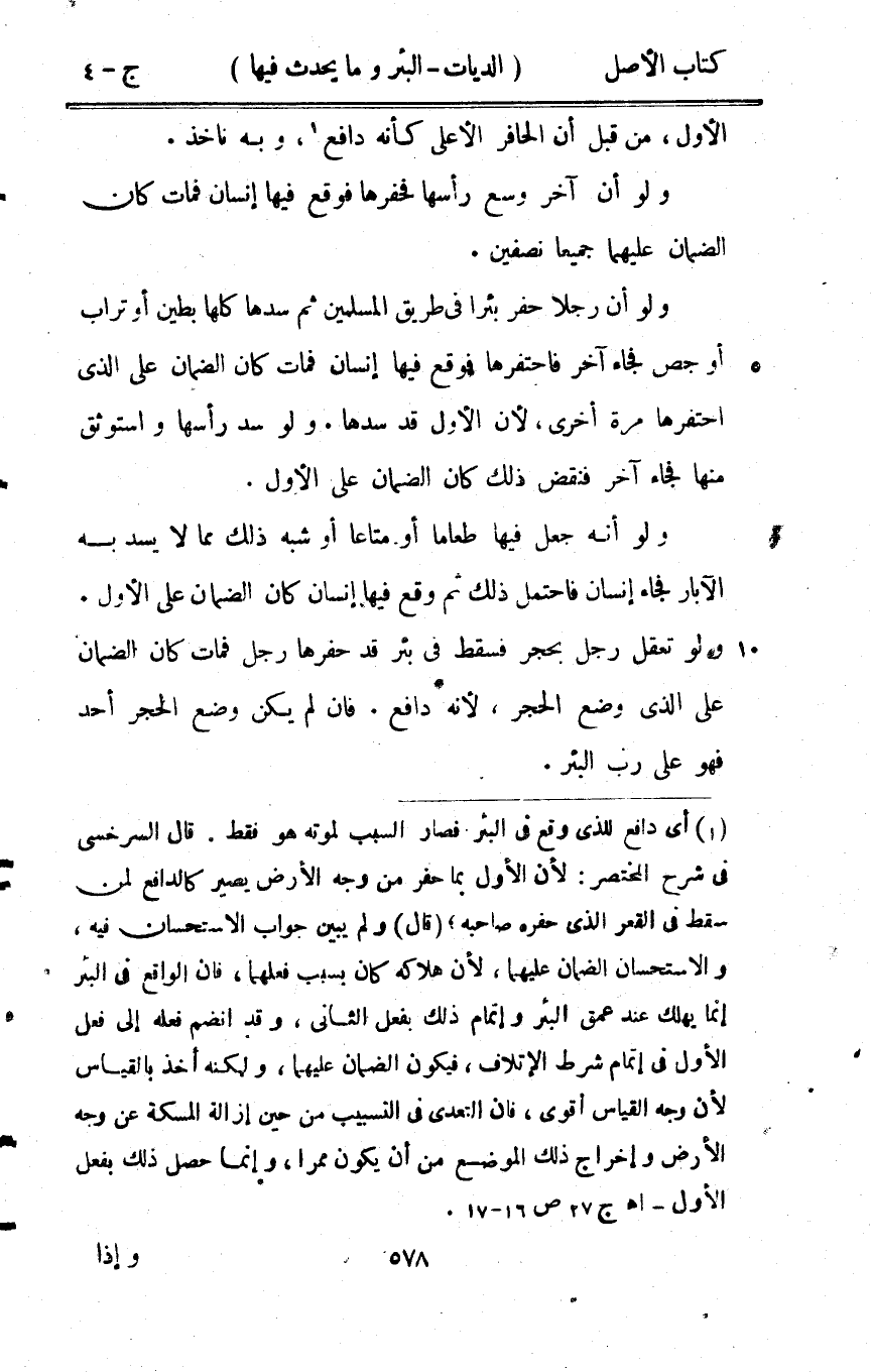 الأول من قبل أَن الْحَافِر الْأَعْلَى كَأَنَّهُ دَافع وَبِه ناخذ وَلَو أَن آخر وسع رَأسهَا فحفرها فَوَقع فِيهَا إِنْسَان فَمَاتَ كَانَ الضَّمَان عَلَيْهِمَا جَمِيعًا نِصْفَيْنِ وَلَو أَن رجلا حفر بِئْرا فِي طَرِيق الْمُسلمين ثمَّ سدها كلهَا بطين أَو تُرَاب أَو جص فجَاء آخر فاحتفرها فَوَقع فِيهَا إِنْسَان فَمَاتَ كَانَ الضَّمَان على الَّذِي احتفرها مرّة أُخْرَى لِأَن الأول قد سدها وَلَو سد رَأسهَا واستوثق مِنْهَا فجَاء آخر فنقض ذَلِك كَانَ الضَّمَان على الأول وَلَو أَنه جعل فِيهَا طَعَاما أَو مَتَاعا أَو شبه ذَلِك مِمَّا لَا يسد بِهِ الْآبَار فجَاء إِنْسَان فَاحْتمل ذَلِك ثمَّ وَقع فِيهَا إِنْسَان كَانَ الضَّمَان على الأول وَلَو تعقل رجل بِحجر فَسقط فِي بِئْر قد حفرهَا رجل فَمَاتَ كَانَ الضَّمَان على الَّذِي وضع الْحجر لِأَنَّهُ دَافع فان لم يكن وضع الْحجر أحد فَهُوَ على رب الْبِئْر