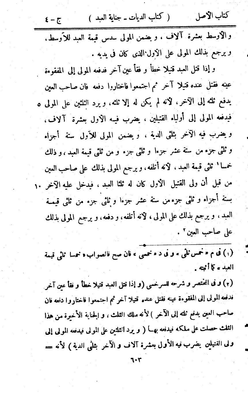 والأوسط بِعشْرَة آلَاف وَيضمن الْمولى سدس قيمَة العَبْد للأوسط وَيرجع بذلك الْمولى على الأول الَّذِي كَانَ فِي يَدَيْهِ وَإِذا قتل العَبْد قَتِيلا خطأ وفقأ عين آخر فَدفعهُ الْمولى إِلَى المفقوءة عينه فَقتل عِنْده قَتِيلا آخر ثمَّ اجْتَمعُوا فَاخْتَارُوا دَفعه فان صَاحب الْعين يدْفع ثلثه إِلَى الآخر لِأَنَّهُ لم يكن لَهُ إِلَّا ثلثه وَيرد الثُّلثَيْنِ على الْمولى فيدفعه الْمولى إِلَى أَوْلِيَاء الْقَتِيلين يضْرب فِيهِ الأول بِعشْرَة آلَاف وَيضْرب فِي الآخر بِثُلثي الدِّيَة وَيضمن الْمولى للْأولِ سِتَّة أَجزَاء وثلثي جُزْء من سِتَّة عشر جُزْءا وثلثي جُزْء وَمن ثُلثي قيمَة العَبْد وَذَلِكَ خمْسا ثُلثي قيمَة العَبْد لِأَنَّهُ أتْلفه وَيرجع الْمولى بذلك على صَاحب الْعين من قبل أَن ولى الْقَتِيل الأول كَانَ لَهُ ثلثا العَبْد فَيدْخل عَلَيْهِ الآخر بِسِتَّة أَجزَاء وثلثي جُزْء من سِتَّة عشر جُزْءا وثلثي جُزْء من ثُلثي قيمَة العَبْد وَيرجع بذلك على الْمولى لِأَنَّهُ أتْلفه وَدفعه وَيرجع الْمولى بذلك على صَاحب الْعين